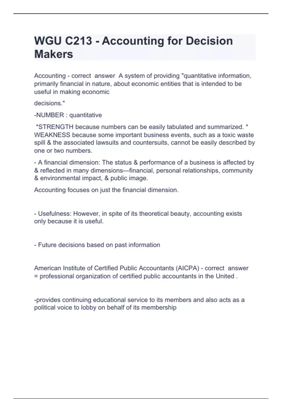 WGU C213 - Accounting for Decision MakersAccounting - correct answer A system of providing "quantitative information, primarily financial in nature, about economic entities that is intended to be useful in making economic decisions." -NUMBER : quantitative *STRENGTH because numbers can be easily tabulated and summarized. * WEAKNESS because some important business events, such as a toxic waste spill & the associated lawsuits and countersuits, cannot be easily described by one or two numbers. - A financial dimension: The status & performance of a business is affected by & reflected in many dimensions—financial, personal relationships, community & environmental impact, & public image. Accounting focuses on just the financial dimension. - Usefulness: However, in spite of its theoretical beauty, accounting exists only because it is useful. - Future decisions based on past information American Institute of Certified Public Accountants (AICPA) - correct answer = professional organization of certified public accountants in the United . -provides continuing educational service to its members and also acts as a political voice to lobby on behalf of its membership