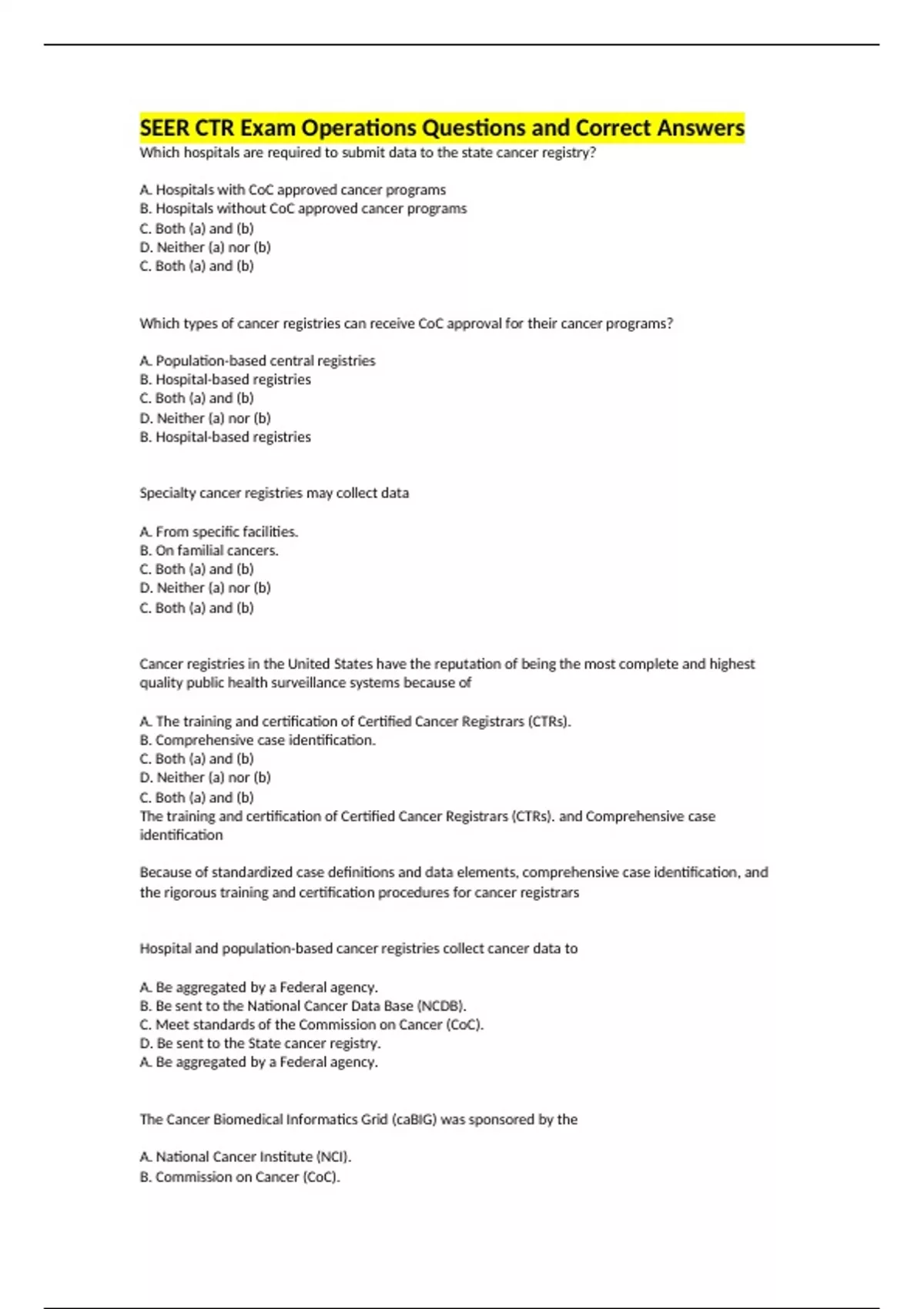 SEER CTR Exam Operations Questions and Correct Answers Which hospitals are required to submit data to the state cancer registry? A. Hospitals with CoC approved cancer programs B. Hospitals without CoC approved cancer programs C. Both (a) and (b) D. Neither (a) nor (b) C. Both (a) and (b) Which types of cancer registries can receive CoC approval for their cancer programs? A. Population-based central registries B. Hospital-based registries C. Both (a) and (b) D. Neither (a) nor (b) B. Hospital-based registries Specialty cancer registries may collect data A. From specific facilities. B. On familial cancers. C. Both (a) and (b) D. Neither (a) nor (b) C. Both (a) and (b) Cancer registries in the United States have the reputation of being the most complete and highest quality public health surveillance systems because of A. The training and certification of Certified Cancer Registrars (CTRs). B. Comprehensive case identification. C. Both (a) and (b) D. Neither (a) nor (b) C. Both (a) and (b) The training and certification of Certified Cancer Registrars (CTRs). and Comprehensive case identification Because of standardized case definitions and data elements, comprehensive case identification, and the rigorous training and certification procedures for cancer registrars Hospital and population-based cancer registries collect cancer data to A. Be aggregated by a Federal agency. B. Be sent to the National Cancer Data Base (NCDB). C. Meet standards of the Commission on Cancer (CoC). D. Be sent to the State cancer registry. A. Be aggregated by a Federal agency. The Cancer Biomedical Informatics Grid (caBIG) was sponsored by the A. National Cancer Institute (NCI). B. Commission on Cancer (CoC).