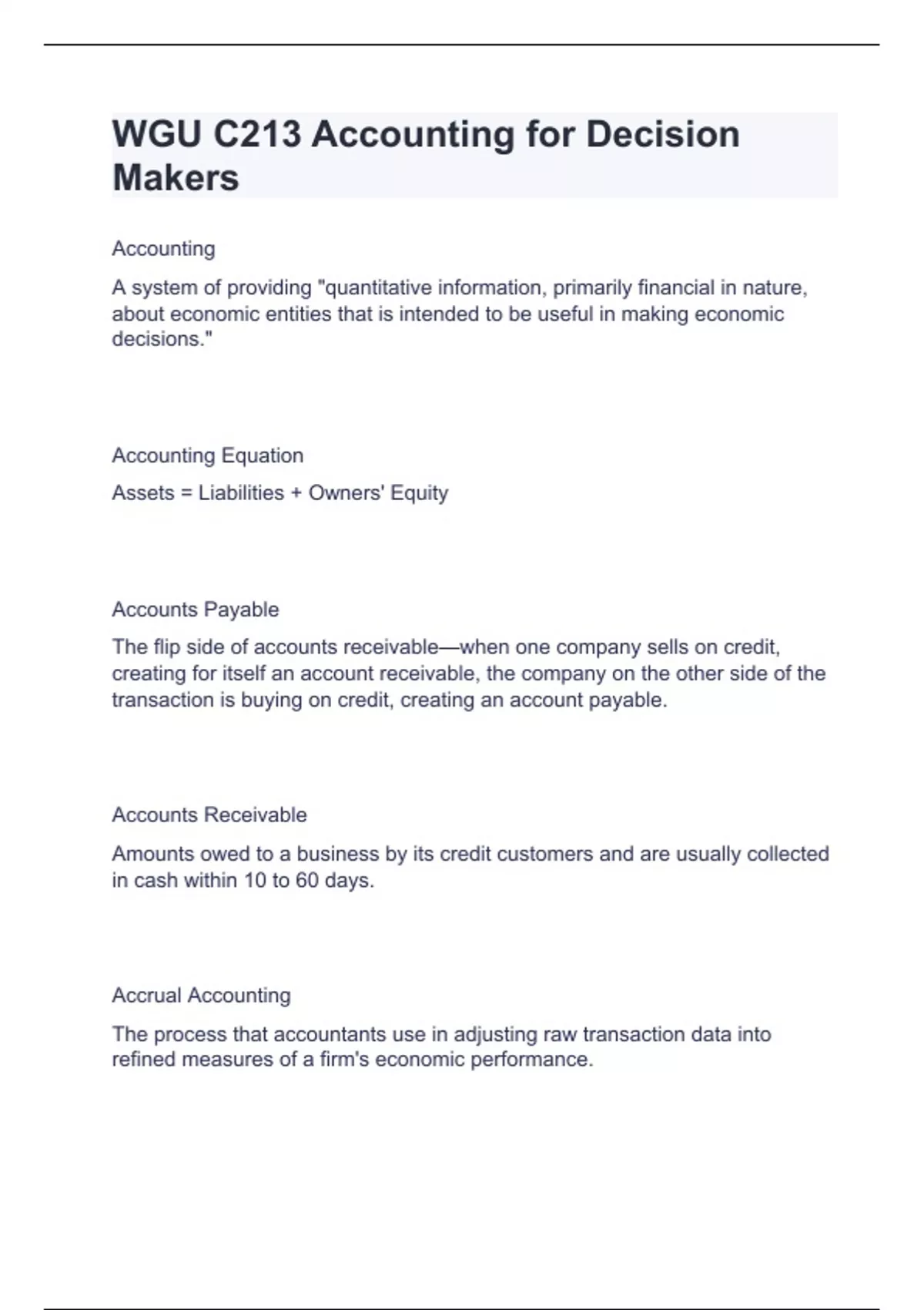 WGU C213 Accounting for Decision MakersAccounting A system of providing "quantitative information, primarily financial in nature, about economic entities that is intended to be useful in making economic decisions." Accounting Equation Assets = Liabilities + Owners' Equity Accounts Payable The flip side of accounts receivable—when one company sells on credit, creating for itself an account receivable, the company on the other side of the transaction is buying on credit, creating an account payable. Accounts Receivable Amounts owed to a business by its credit customers and are usually collected in cash within 10 to 60 days. Accrual Accounting The process that accountants use in adjusting raw transaction data into refined measures of a firm's economic performance.