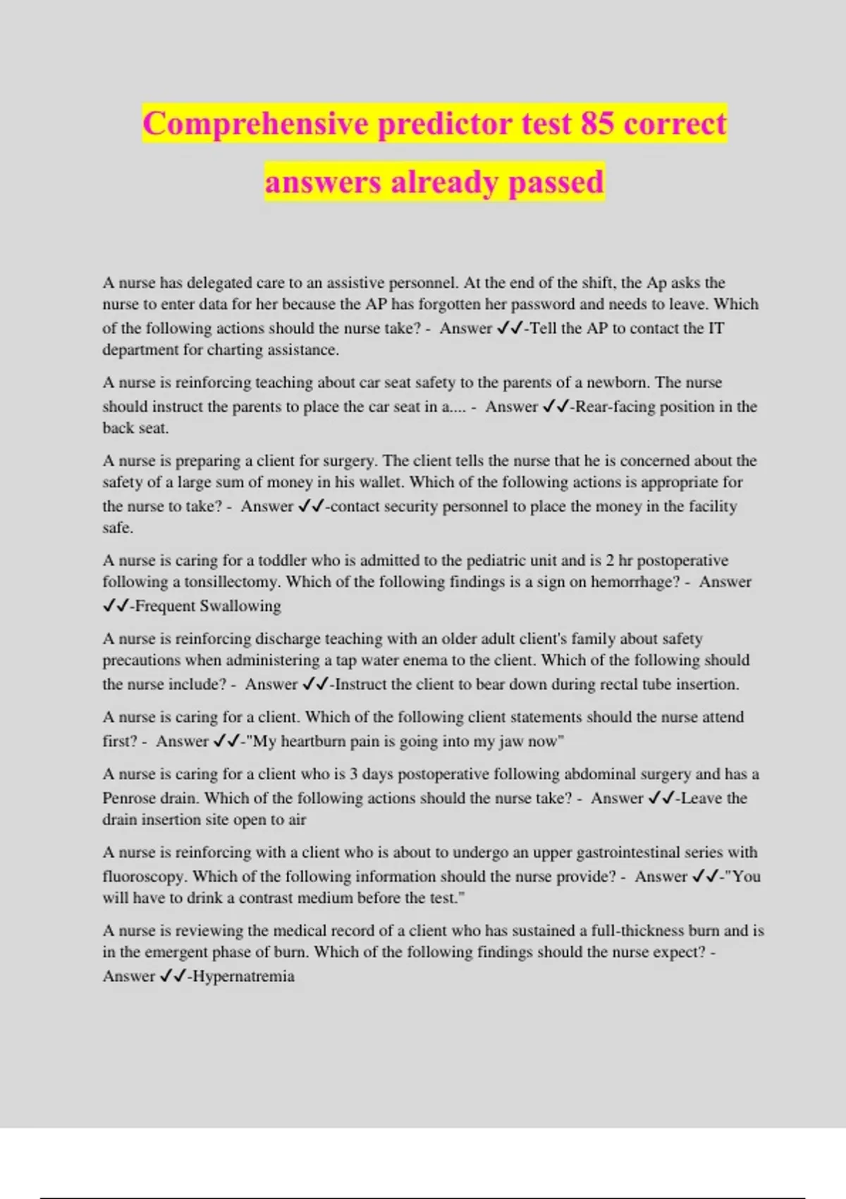 Comprehensive predictor test 85 correct answers already passed A nurse has delegated care to an assistive personnel. At the end of the shift, the Ap asks the nurse to enter data for her because the AP has forgotten her password and needs to leave. Which of the following actions should the nurse take? - Answer ️️ -Tell the AP to contact the IT department for charting assistance. A nurse is reinforcing teaching about car seat safety to the parents of a newborn. The nurse should instruct the parents to place the car seat in a.... - Answer ️️ -Rear-facing position in the back seat. A nurse is preparing a client for surgery. The client tells the nurse that he is concerned about the safety of a large sum of money in his wallet. Which of the following actions is appropriate for the nurse to take? - Answer ️️ -contact security personnel to place the money in the facility safe. A nurse is caring for a toddler who is admitted to the pediatric unit and is 2 hr postoperative following a tonsillectomy. Which of the following findings is a sign on hemorrhage? - Answer ️️ -Frequent Swallowing A nurse is reinforcing discharge teaching with an older adult client's family about safety precautions when administering a tap water enema to the client. Which of the following should the nurse include? - Answer ️️ -Instruct the client to bear down during rectal tube insertion. A nurse is caring for a client. Which of the following client statements should the nurse attend first? - Answer ️️ -"My heartburn pain is going into my jaw now" A nurse is caring for a client who is 3 days postoperative following abdominal surgery and has a Penrose drain. Which of the following actions should the nurse take? - Answer ️️ -Leave the drain insertion site open to air A nurse is reinforcing with a client who is about to undergo an upper gastrointestinal series with fluoroscopy. Which of the following information should the nurse provide? - Answer ️️ -"You will have to drink a contrast medium before the test." A nurse is reviewing the medical record of a client who has sustained a full-thickness burn and is in the emergent phase of burn. Which of the following findings should the nurse expect? - Answer ️️ -Hypernatremia A nurse is planing to administer an ophthalmic medication to a client. Which of the following actions would minimize systemic absorption of the medication? - Answer ️️ -Wait 5 mins after instillation before instilling the drops in the other eye A nurse is preparing morning medication for a client who has potassium level of 3.2 mEq/L. For which of the following medications should the nurse withhold administration and notify the provider? - Answer ️️ -Furosemide A nurse is collecting data from a client who has preeclampsia and is receiving magnesium sulfate via a continuous IV infusion. Which of the following findings should the nurse report to the provider? - Answer ️️ -Facial flushing A nurse in a provider'a office is collecting data from a client who was discharged from the hospital 7 days ago following treatment from deep-vein thrombosis. Which of the following findings is the nurse's priority? - Answer ️️ -The client takes ibuprofen to treat musculosketal pain. A nurse in an urgent care clinic is collecting data from a client who reports having diarrhea for the past 3 days. Which of the following findings indicates hypokalemia? - Answer ️️ -Muscle weakness A nurse is participating in a performance improvement process to decrease the rate of health care-associated infections within the facility. The nurse should recognize that which of the following is an appropriate performance improvement outcome indicator? - Answer ️️ -Client data indicates a decreased rate of infection A nurse is establishing a baseline postoperative assessment for a client who is recovering from a right femoropopliteal bypass graft. Which of the following findings in the assessment of the clients's right leg should be of the most concern to the nurse? - Answer ️️ -The client's foot feels cooler than the previous assessment A nurse is preparing a client regimen. Which of the following insulins can be mixed? - Answer ️️ -Aspart Regular Detemir Lispro Glargine cannot be mixed with any insulin A nurse is caring for a school-age child whose family adheres to a vegan diet in the home. The nurse should recognize the child is at risk for deficiency of which of the following? - Answer ️️ -Vitamin D A nurse is reinforcing teaching with a postpartum client. Which of the following should the nurse explain as the most important reason for staff to wear identification? - Answer ️️ -Reducing the risk of newborn abduction A nurse is reinforcing teaching with a group of expectant parents regarding the proper use of a car seat. Which of the following statements by the parent indicates an understanding of the teaching? - Answer ️️ -I can place a rolled towel on each side of my newborn's head until he can hold his head up. A nurse on a mental health unit is discussing client rights with a group of coworkers. Which of the following statements should the nurse include? - Answer ️️ -A nurse must withdraw consent for treatment in writing if he is competent to do so. A nurse from a medical-surgical unit is floating to a postpartum unit. Which of the following clients is an appropriate assignment for the nurse to accept? - Answer ️️ -A client who had a cesarean delivery 24hr ago A nurse is caring for a client who is in mechanical restraints after becoming violent with a staff member. Which of the following actions should the nurse take? - Answer ️️ -Document in the client's medical record every 15 mins A nurse is reinforcing teaching with the family of a client who is receiving palliative care for terminal cancer. Which of the following guidelines should the nurse emphasize about appropriate pain control measures? - Answer ️️ -Administer schedule doses of medication fro