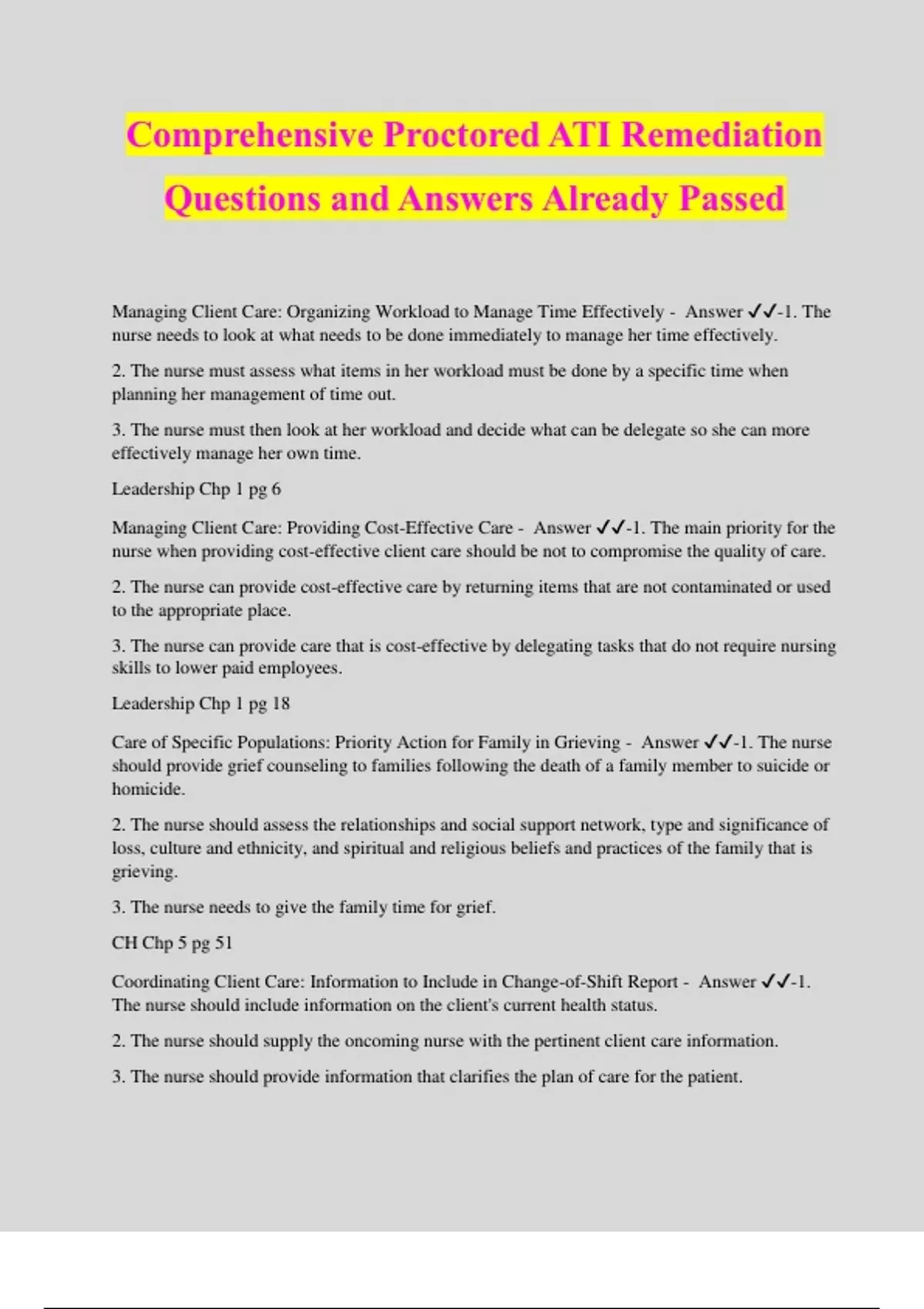 Comprehensive Proctored ATI Remediation Questions and Answers Already Passed Managing Client Care: Organizing Workload to Manage Time Effectively - Answer ️️ -1. The nurse needs to look at what needs to be done immediately to manage her time effectively. 2. The nurse must assess what items in her workload must be done by a specific time when planning her management of time out. 3. The nurse must then look at her workload and decide what can be delegate so she can more effectively manage her own time. Leadership Chp 1 pg 6 Managing Client Care: Providing Cost-Effective Care - Answer ️️ -1. The main priority for the nurse when providing cost-effective client care should be not to compromise the quality of care. 2. The nurse can provide cost-effective care by returning items that are not contaminated or used to the appropriate place. 3. The nurse can provide care that is cost-effective by delegating tasks that do not require nursing skills to lower paid employees. Leadership Chp 1 pg 18 Care of Specific Populations: Priority Action for Family in Grieving - Answer ️️ -1. The nurse should provide grief counseling to families following the death of a family member to suicide or homicide. 2. The nurse should assess the relationships and social support network, type and significance of loss, culture and ethnicity, and spiritual and religious beliefs and practices of the family that is grieving. 3. The nurse needs to give the family time for grief. CH Chp 5 pg 51 Coordinating Client Care: Information to Include in Change-of-Shift Report - Answer ️️ -1. The nurse should include information on the client's current health status. 2. The nurse should supply the oncoming nurse with the pertinent client care information. 3. The nurse should provide information that clarifies the plan of care for the patient. Leadership Chp 2 pg 26 Managing Client Care: Prioritizing Client Care - Answer ️️ -1. The nurse should prioritize systemic before local when prioritizing care of clients. 2. The nurse should prioritize actual problems over potential problems when planning care of patients. 3. The nurse is to prioritize acute issues over chronic ones when planning and giving care to a patient. Leadership Chp 1 pg 5 Information Technology: Appropriate Documentation - Answer ️️ -1. Documentation should be done to provide continuity of care and promote client safety. 2. Documentation should be precise only what the nurse sees, hears, feels and smells. 3. The nurse should only use abbreviations and symbols that are approved by the facility and the Joint Commission. FUND Chp 5 pg 21 Pressure Ulcers, Wounds, and Wound Management: Revising the Plan of Care - Answer ️️ -1. The nurse should provide the patient with adequate hydration and meet their protein and calorie need to reduce the risk of skin impairment. 2. The nurse should assess the level of serum albumin and if it is less than 3.5 g/dL the nurse should increase the patient's protein and note that they are at an increased risk for skin impairment. 3. The nurse should not use cotton balls or other materials that shed fibers when cleaning out wounds. FUND Chp 55 pg 330 Adverse Effects, Interactions, and Contraindications: Priority Action to an Allergic Response - Answer ️️ -1. The nurse must first treat the anaphylatic reaction with epinephrine, bronchodilators, and antihistamines. 2. The nurse's next priority is to provide respiratory support, and to contact the provider when the client is experiencing a reaction. 3. The nurse before administering any medication should obtain a complete medical history to avoid allergic responses if possible. Pharm Chp 5 pg 36 Medications Affecting Blood Pressure: Priority Adverse Effect of Losartan - Answer ️️ -1. The patient taking Losartan may experience angioedema which would present as skin wheals and swelling of tongue. 2. If the patient were to develop angioedema the priority is to administer an injection of epinephrine. 3. Another priority adverse effect of losartan is fetal death when taking in the second and third trimester. Pharm Chp 20 pg 252 Ergonomic Principles: Evaluating Lifting Techniques - Answer ️️ -1. If you are getting the object from the floor one needs to flex your hips, knees and back. 2. The nurse needs to keep the object as close to their body as they can to decrease back strain. 3. As the nurse is bringing the object to thigh level she needs to bend at the knee and keep her back straight. FUND Chp 14 pg 71 Cancer Treatment Options: Caring for a Client Who Has a Radiation Implant - Answer ️️ -1. The nurse should wear a lead apron when caring for the patient, they should keep the front of the apron facing the radiation source. 2. The nurse should limit visitors to 30-minutes visits and they should keep the visitors at least 6 feet away from the source. 3. The patients waste products are radioactive, they should not be touched by anyone. AMS Chp 91 pg 583 Home Safety: Needle Disposal in Home Settings - Answer ️️ -1. The nurse should instruct the patient to put needles into a container that has a lid and is strong enough to keep the needles from sticking through the sides, such as a liquid detergent bottle or metal can. 2. The patient should throw away the container before it is full all the way to the top with needles. 3. Once the container is ready to be thrown away the nurse should instruct the patient to put the container in the center of their garbage. FUND Chp 13 Facility Protocols: Client Evacuation in Response to a Fire - Answer ️️ -1. The first priority with a fire is to rescue the patients and other individuals from the area. 2. The ambulatory clients should relocate themselves if possible in the case of a fire. 3. After the clients are evacuated the next action for the nurse to take in response to a fire is to pull the fire alarm. Leadership Chp 5 pg 73 Communicable Diseases: Understanding Transmission of Varicella - Answer ️️ -1. The nurse shou