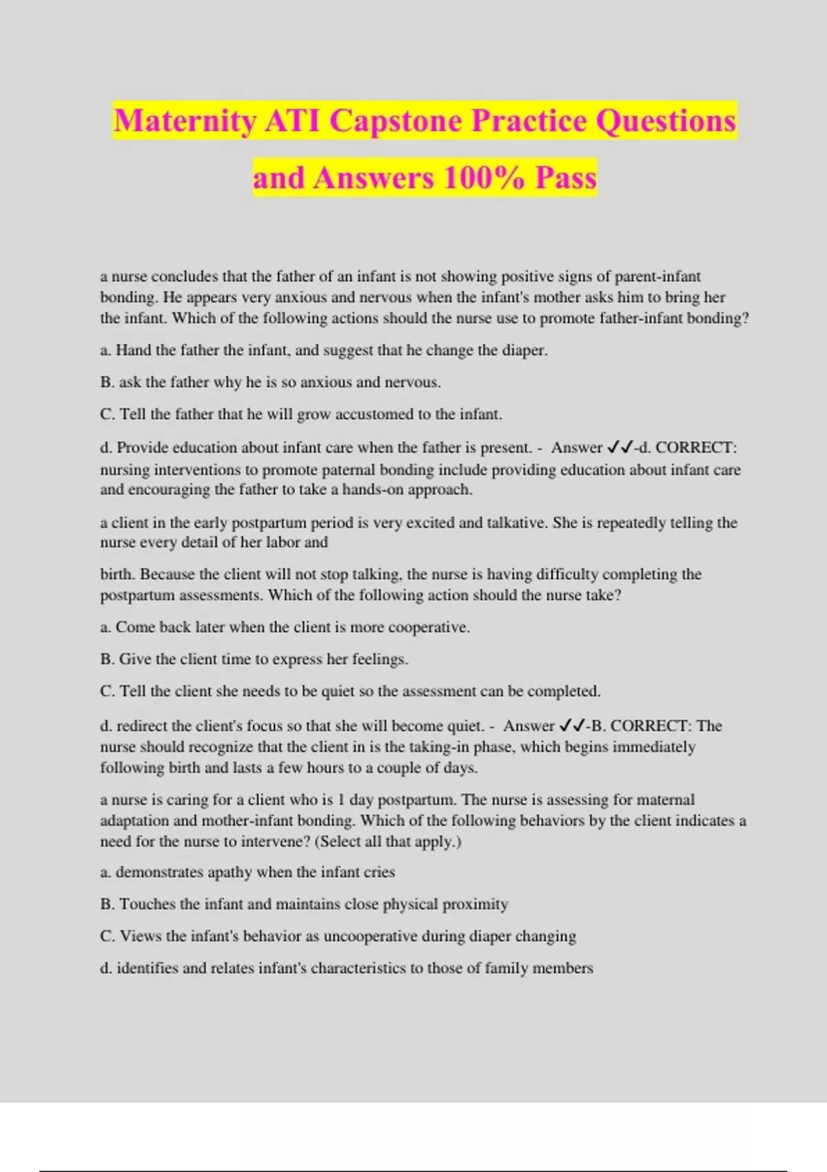 Maternity ATI Capstone Practice Questions and Answers 100% Pass a nurse concludes that the father of an infant is not showing positive signs of parent‐infant bonding. He appears very anxious and nervous when the infant's mother asks him to bring her the infant. Which of the following actions should the nurse use to promote father‐infant bonding? a. Hand the father the infant, and suggest that he change the diaper. B. ask the father why he is so anxious and nervous. C. Tell the father that he will grow accustomed to the infant. d. Provide education about infant care when the father is present. - Answer ️️ -d. CORRECT: nursing interventions to promote paternal bonding include providing education about infant care and encouraging the father to take a hands‐on approach. a client in the early postpartum period is very excited and talkative. She is repeatedly telling the nurse every detail of her labor and birth. Because the client will not stop talking, the nurse is having difficulty completing the postpartum assessments. Which of the following action should the nurse take? a. Come back later when the client is more cooperative. B. Give the client time to express her feelings. C. Tell the client she needs to be quiet so the assessment can be completed. d. redirect the client's focus so that she will become quiet. - Answer ️️ -B. CORRECT: The nurse should recognize that the client in is the taking‐in phase, which begins immediately following birth and lasts a few hours to a couple of days. a nurse is caring for a client who is 1 day postpartum. The nurse is assessing for maternal adaptation and mother‐infant bonding. Which of the following behaviors by the client indicates a need for the nurse to intervene? (Select all that apply.) a. demonstrates apathy when the infant cries B. Touches the infant and maintains close physical proximity C. Views the infant's behavior as uncooperative during diaper changing d. identifies and relates infant's characteristics to those of family members e. interprets the infant's behavior as meaningful and a way of expressing needs - Answer ️️ -C. CORRECT: a client's view of her infant as being uncooperative during diaper changing is a sign of impaired maternal‐infant bonding. a nurse is caring for a client who is 2 days postpartum. The client states, "My 4‐year old son was toilet trained and now he is frequently wetting himself." Which of the following statements should the nurse provide to the client? a. "your son was probably not ready for toilet training and should wear training pants." B. "your son is showing an adverse sibling response." C."your son may need counseling." d."you should try sending your son to preschool to resolve the behavior." - Answer ️️ -B. CORRECT: adverse responses by a sibling to a new infant can include regression in toileting habits. a nurse in the delivery room is planning to promote maternal‐infant bonding for a client who just delivered. Which of the following is the priority action by the nurse? a. encourage the parents to touch and explore the neonate's features. B. limit noise and interruption in the delivery room. C. Place the neonate at the client's breast. d. Position the neonate skin‐to‐skin on the client's chest. - Answer ️️ -d. CORRECT: Placing the neonate in the en face position on the client's chest immediately after birth is the priority nursing intervention to promote maternal‐infant bonding. a nurse on the postpartum unit is caring for four clients. Which of the following clients should the nurse recognize as the greatest risk for development of a postpartum infection? a. a client who experienced a precipitous labor less than 3 hr in duration B. a client who had premature rupture of membranes and prolonged labor c. a client who delivered a large for gestational age infant D. a client who had a boggy uterus that was not well‐contracted - Answer ️️ -B. CORRECT: Premature rupture of membranes with prolonged labor poses the greatest risk for developing a postpartum infection because the birth canal was open, allowing pathogens to enter. A nurse is teaching a client who is breastfeeding and has mastitis. Which of the following responses should the nurse make? a. "Limit the amount of time the infant nurses on each breast." B. "nurse the infant only on the unaffected breast until resolved." c."completely empty each breast at each feeding or use a pump." D."Wear a tight‐fitting bra until lactation has ceased." - Answer ️️ -c. CORRECT: Instruct the client to completely empty each breast at each feeding to prevent milk stasis, which provides a medium for bacterial growth. a nurse is reviewing discharge teaching with a client who has a urinary tract infection. Which of the following statements by the client indicates understanding of the teaching? (select all that apply.) a. "I will perform peri care and apply a perineal pad in a back‐to‐front direction." B. "I will drink cranberry and prune juices to make my urine more acidic." c."I will drink large amounts of fluids to flush the bacteria from my urinary tract." D."I will go back to breastfeeding after I have finished taking the antibiotic." e. "I will take tylenol for any discomfort." - Answer ️️ -B. CORRECT: acidification of urine inhibits bacterial multiplication. c. CORRECT: Increased fluid intake can help to flush the bacteria from the urinary tract. e. CORRECT: acetaminophen is taken to reduce discomfort and pain associated with a urinary tract infection. a nurse is caring for a client who has mastitis. Which of the following is the typical causative agent of mastitis? a. Staphylococcus aureus B. Chlamydia trachomatis c. Klebsiella pneumonia D. Clostridium perfringens - Answer ️️ -a. CORRECT: Staphylococcus aureus, Escherichia coli, and streptococcus are usually the infecting agents that enter the breast due to sore or cracked nipples, which results in mastitis. a nurse is discussing risks factors for urinar