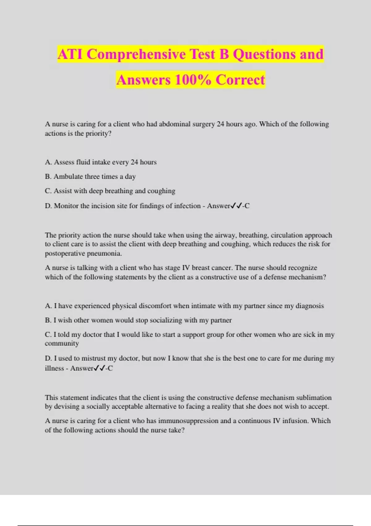 ATI Comprehensive Test B Questions and Answers 100% Correct A nurse is caring for a client who had abdominal surgery 24 hours ago. Which of the following actions is the priority? A. Assess fluid intake every 24 hours B. Ambulate three times a day C. Assist with deep breathing and coughing D. Monitor the incision site for findings of infection - Answer️️ -C The priority action the nurse should take when using the airway, breathing, circulation approach to client care is to assist the client with deep breathing and coughing, which reduces the risk for postoperative pneumonia. A nurse is talking with a client who has stage IV breast cancer. The nurse should recognize which of the following statements by the client as a constructive use of a defense mechanism? A. I have experienced physical discomfort when intimate with my partner since my diagnosis B. I wish other women would stop socializing with my partner C. I told my doctor that I would like to start a support group for other women who are sick in my community D. I used to mistrust my doctor, but now I know that she is the best one to care for me during my illness - Answer️️ -C This statement indicates that the client is using the constructive defense mechanism sublimation by devising a socially acceptable alternative to facing a reality that she does not wish to accept. A nurse is caring for a client who has immunosuppression and a continuous IV infusion. Which of the following actions should the nurse take? A. Assess the clients IV site every 8 hours B. Check the clients WBC count every 48 hours C. Monitor the clients mouth every 8 hours D. Change the clients IV tubing every 48 hours - Answer️️ -C A nurse is caring for a 2-month-old infant who has Hirschsprung disease (HD). Which of the following areas should the nurse assess for manifestations of HD? A. Eyes area B. Chest area C. Lower abdominal area - Answer️️ -C Hirschsprung disease is a condition that affects the large intestine (colon) and causes problems with passing stool. This is present at birth (congenital) as a result of missing nerve cells in the muscle of the baby's colon A nurse at a mental health clinic is caring for four clients. The nurse should recognize that which of the following clients is using dissociation as a defense mechanism? A. A client forgets to buy their partner a birthday gift after a disagreement B. A client who was abused as a child describes the abuse as if it happened to someone else. C. A client who is shorter than average is verbally assertive with coworkers D. A client states that they did not get a job promotion because the boss did not like them - Answer️️ -B A nurse is providing teaching to a client who has a new diagnosis of type 1 diabetes mellitus. The nurse should instruct the client to monitor for which of the following findings as a manifestation of hypoglycemia? A. irritability B. increased urination C. vomiting D. facial flushing - Answer️️ -A A nurse in an outpatient mental health clinic is caring for four clients. The nurse should recognize that which of the following clients is effectively using sublimation as a defense mechanism? A. A client who transfers their anger about their job onto their family and then apologizes B. A client who misses provider appointments because they say they are too busy C. A client who channels their energy into a new hobby following the loss of their job D. A client whose partner died 4 years ago sets a place for him at dinner each night - Answer️️ -C The nurse should identify that this client is using the defense mechanism of sublimation by channeling negative feelings over the loss of their job into a new hobby. A hospice nurse is consulting with a client and her family about receiving home services. Which of the following statements should the nurse identify as an indication that the family understands home hospice care? A. "We can expect the hospice nurse to provide support for us after our mother's death." B. A hospice nurse will come to the house each time our mother needs pain medication C. Now that my mother is receiving hospice services, we will not be able to get respite care D. Hospice care focuses on arranging treatment that will prolong our mother's life - Answer️️ - A Hospice care includes bereavement services after a family member's death. A nurse is caring for a client who has active pulmonary tuberculosis. Which of the following actions should the nurse take? A. Wear a surgical mask when providing client care B. Have visitors maintain a distance of 1.8m (6 feet) from the client C. Restrict fresh flowers from the clients room D. Assign the client to a private room with negative air pressure - Answer️️ -D A nurse is providing teaching to a client who is at 24 weeks of gestation and is scheduled for a 3- hr oral glucose tolerance test. Which of the following instructions should the nurse include in the teaching? A. Limit your fat intake for 72 hours before the test B. You will need to fast the night before the test C. We will collect a urine sample the day after testing D. A blood sample will be collected every 15 minutes during the test - Answer️️ -B A nurse on a pediatric unit has received change-of-shift report for four children. Which of the following children should the nurse assess first? A. A 6month old infant who has croup and an O2 saturation of 92% on room air B. A 15 year old adolescent who is 2 hour postop following an open reduction and internal fixation of the left ankle and is requesting pain medication C. A 3 year old toddler who has gastroenteritis, moderate dehydration, and had 2 loose bowel movements over the past 24 hours D. A 10-year-old child who is awaiting surgery for an appendectomy and experienced sudden relief from pain. - Answer️️ -D A nurse in a community center is providing an educational session to a group of clients about ovarian cancer. Which of the following manifestations of ovarian cancer should the nurse incl