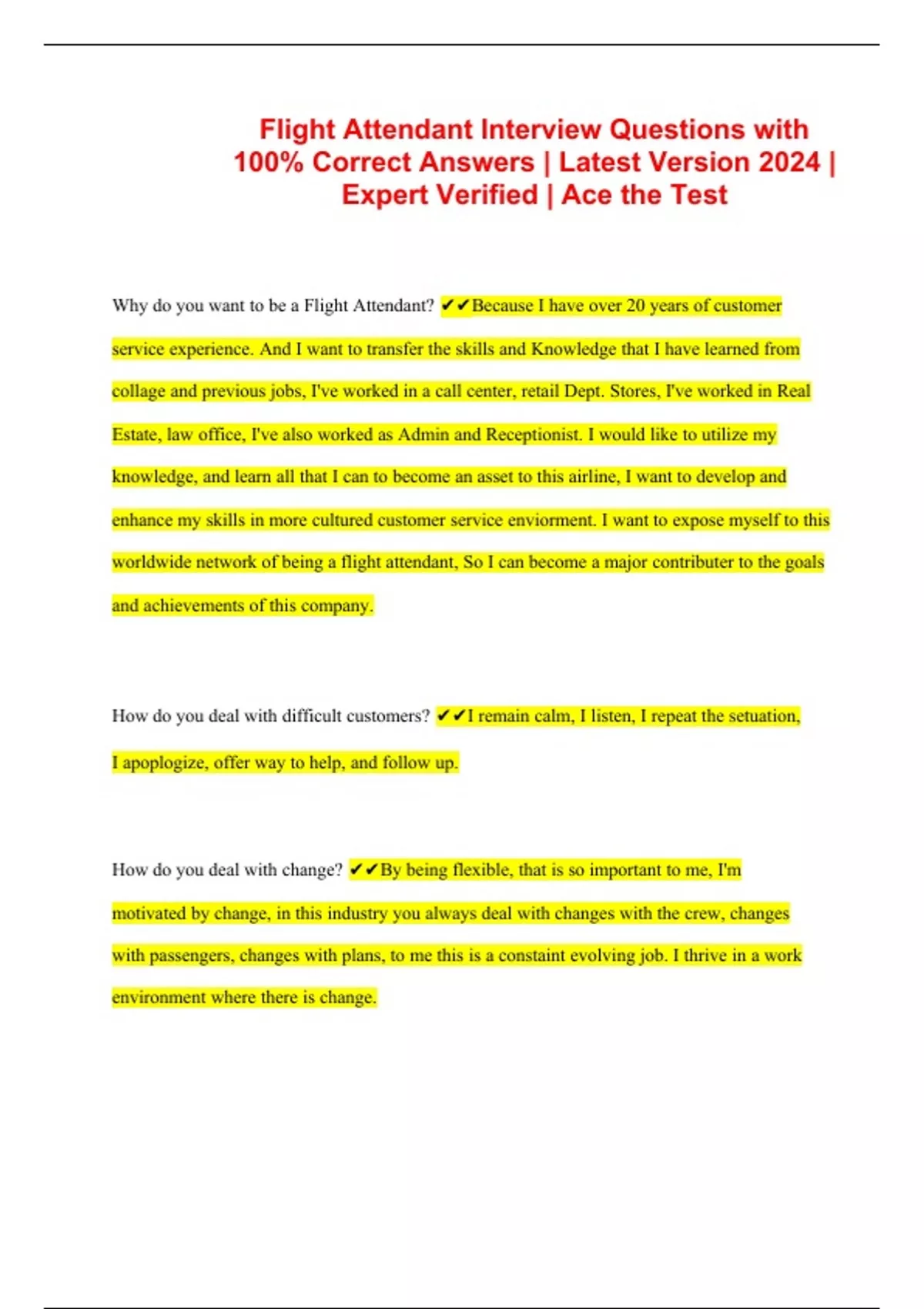 Flight Attendant Interview Questions with 100% Correct Answers | Latest Version 2024 | Expert Verified | Ace the Test