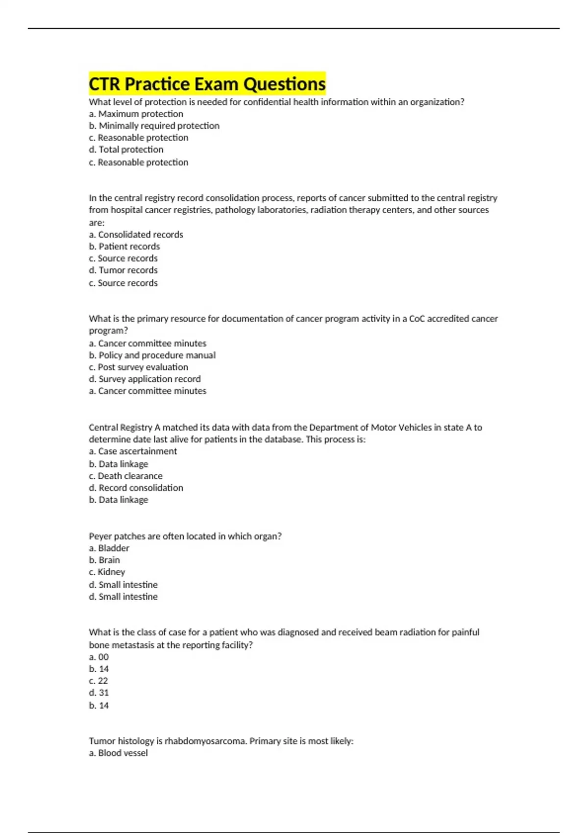 CTR Practice Exam Questions What level of protection is needed for confidential health information within an organization? a. Maximum protection b. Minimally required protection c. Reasonable protection d. Total protection c. Reasonable protection In the central registry record consolidation process, reports of cancer submitted to the central registry from hospital cancer registries, pathology laboratories, radiation therapy centers, and other sources are: a. Consolidated records b. Patient records c. Source records d. Tumor records c. Source records What is the primary resource for documentation of cancer program activity in a CoC accredited cancer program? a. Cancer committee minutes b. Policy and procedure manual c. Post survey evaluation d. Survey application record a. Cancer committee minutes Central Registry A matched its data with data from the Department of Motor Vehicles in state A to determine date last alive for patients in the database. This process is: a. Case ascertainment b. Data linkage c. Death clearance d. Record consolidation b. Data linkage Peyer patches are often located in which organ? a. Bladder b. Brain c. Kidney d. Small intestine d. Small intestine What is the class of case for a patient who was diagnosed and received beam radiation for painful bone metastasis at the reporting facility? a. 00 b. 14 c. 22 d. 31 b. 14 Tumor histology is rhabdomyosarcoma. Primary site is most likely: a. Blood vessel
