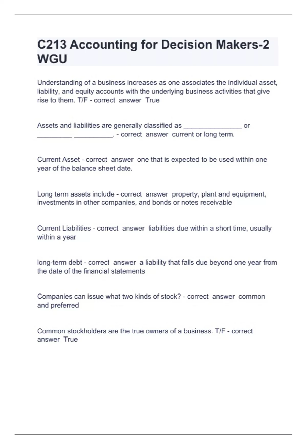C213 Accounting for Decision Makers-2 WGU Understanding of a business increases as one associates the individual asset, liability, and equity accounts with the underlying business activities that give rise to them. T/F - correct answer True Assets and liabilities are generally classified as _______________ or _________ __________. - correct answer current or long term. Current Asset - correct answer one that is expected to be used within one year of the balance sheet date. Long term assets include - correct answer property, plant and equipment, investments in other companies, and bonds or notes receivable Current Liabilities - correct answer liabilities due within a short time, usually within a year long-term debt - correct answer a liability that falls due beyond one year from the date of the financial statements Companies can issue what two kinds of stock? - correct answer common and preferred Common stockholders are the true owners of a business. T/F - correct answer True