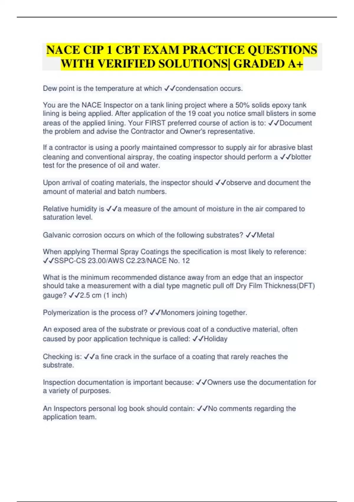 NACE CIP 1 CBT EXAM PRACTICE QUESTIONS WITH VERIFIED SOLUTIONS| GRADED A+