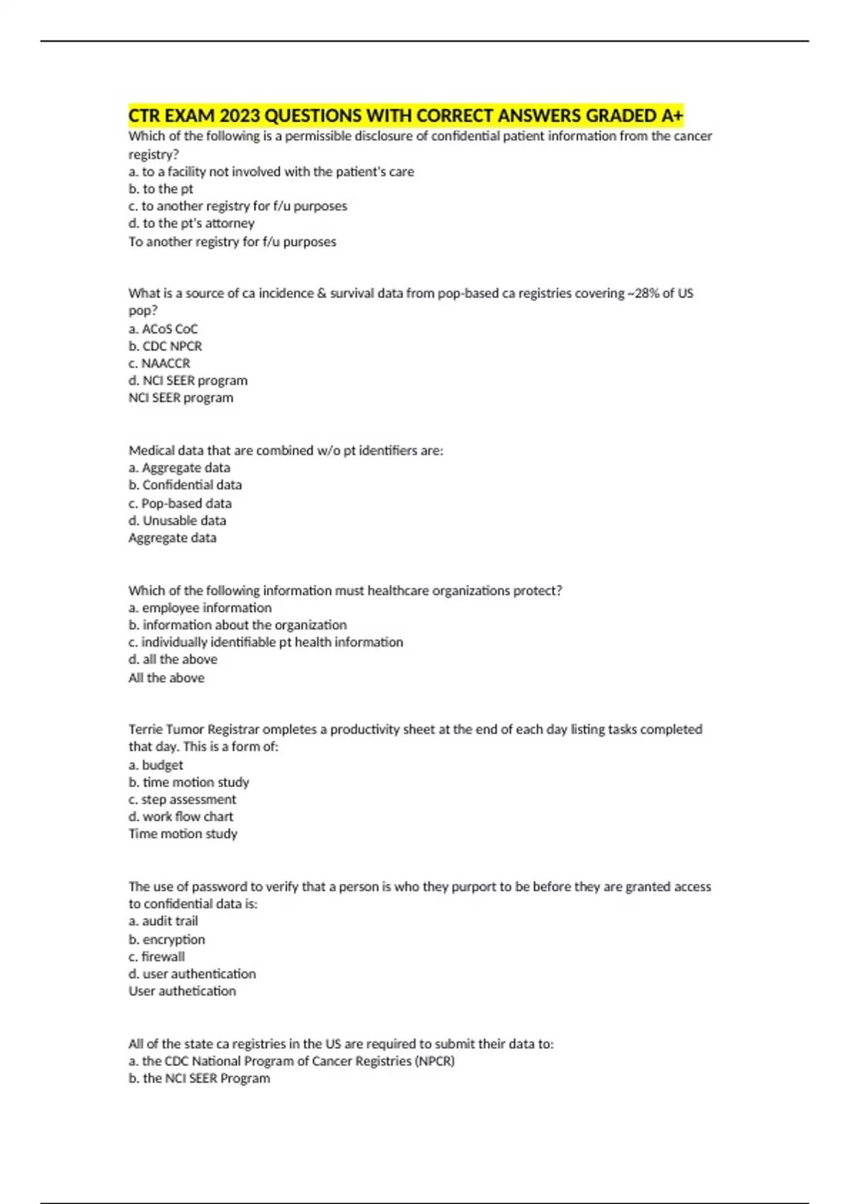 CTR EXAM 2023 QUESTIONS WITH CORRECT ANSWERS GRADED A+ Which of the following is a permissible disclosure of confidential patient information from the cancer registry? a. to a facility not involved with the patient's care b. to the pt c. to another registry for f/u purposes d. to the pt's attorney To another registry for f/u purposes What is a source of ca incidence & survival data from pop-based ca registries covering ~28% of US pop? a. ACoS CoC b. CDC NPCR c. NAACCR d. NCI SEER program NCI SEER program Medical data that are combined w/o pt identifiers are: a. Aggregate data b. Confidential data c. Pop-based data d. Unusable data Aggregate data Which of the following information must healthcare organizations protect? a. employee information b. information about the organization c. individually identifiable pt health information d. all the above All the above Terrie Tumor Registrar ompletes a productivity sheet at the end of each day listing tasks completed that day. This is a form of: a. budget b. time motion study c. step assessment d. work flow chart Time motion study The use of password to verify that a person is who they purport to be before they are granted access to confidential data is: a. audit trail b. encryption c. firewall d. user authentication User authetication All of the state ca registries in the US are required to submit their data to: a. the CDC National Program of Cancer Registries (NPCR) b. the NCI SEER Program c. Either CDC/NPCR or NCI/SEER
