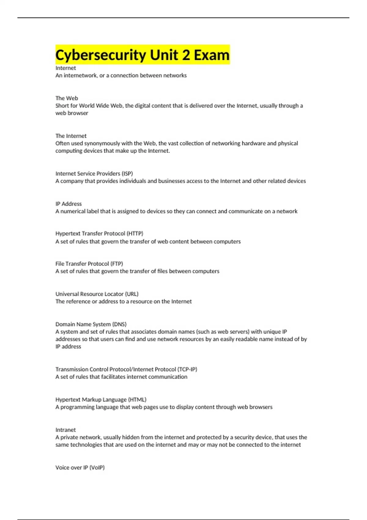 Cybersecurity Unit 2 Exam Internet An internetwork, or a connection between networks The Web Short for World Wide Web, the digital content that is delivered over the Internet, usually through a web browser The Internet Often used synonymously with the Web, the vast collection of networking hardware and physical computing devices that make up the Internet. Internet Service Providers (ISP) A company that provides individuals and businesses access to the Internet and other related devices IP Address A numerical label that is assigned to devices so they can connect and communicate on a network Hypertext Transfer Protocol (HTTP) A set of rules that govern the transfer of web content between computers File Transfer Protocol (FTP) A set of rules that govern the transfer of files between computers Universal Resource Locator (URL) The reference or address to a resource on the Internet Domain Name System (DNS) A system and set of rules that associates domain names (such as web servers) with unique IP addresses so that users can find and use network resources by an easily readable name instead of by IP address Transmission Control Protocol/Internet Protocol (TCP-IP) A set of rules that facilitates internet communication Hypertext Markup Language (HTML) A programming language that web pages use to display content through web browsers Intranet A private network, usually hidden from the internet and protected by a security device, that uses the same technologies that are used on the internet and may or may not be connected to the internet Voice over IP (VoIP)