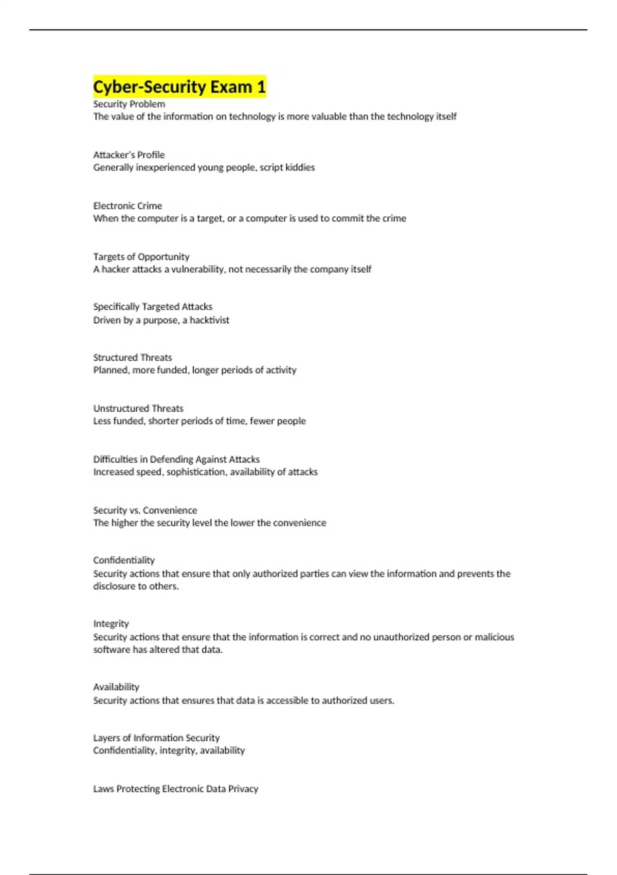 Cyber-Security Exam 1 Security Problem The value of the information on technology is more valuable than the technology itself Attacker's Profile Generally inexperienced young people, script kiddies Electronic Crime When the computer is a target, or a computer is used to commit the crime Targets of Opportunity A hacker attacks a vulnerability, not necessarily the company itself Specifically Targeted Attacks Driven by a purpose, a hacktivist Structured Threats Planned, more funded, longer periods of activity Unstructured Threats Less funded, shorter periods of time, fewer people Difficulties in Defending Against Attacks Increased speed, sophistication, availability of attacks Security vs. Convenience The higher the security level the lower the convenience Confidentiality Security actions that ensure that only authorized parties can view the information and prevents the disclosure to others. Integrity Security actions that ensure that the information is correct and no unauthorized person or malicious software has altered that data. Availability Security actions that ensures that data is accessible to authorized users. Layers of Information Security Confidentiality, integrity, availability Laws Protecting Electronic Data Privacy