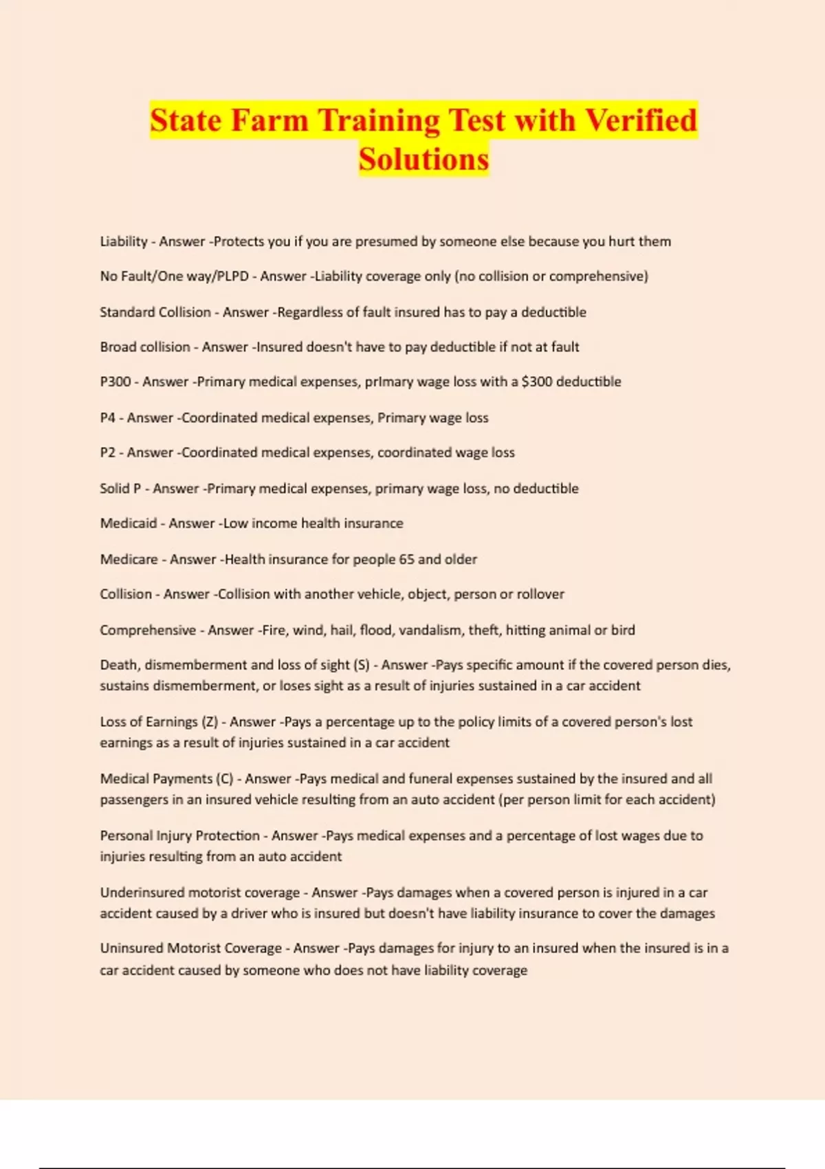 State Farm Training Test with Verified Solutions Liability - Answer -Protects you if you are presumed by someone else because you hurt them No Fault/One way/PLPD - Answer -Liability coverage only (no collision or comprehensive) Standard Collision - Answer -Regardless of fault insured has to pay a deductible Broad collision - Answer -Insured doesn't have to pay deductible if not at fault P300 - Answer -Primary medical expenses, prImary wage loss with a $300 deductible P4 - Answer -Coordinated medical expenses, Primary wage loss P2 - Answer -Coordinated medical expenses, coordinated wage loss Solid P - Answer -Primary medical expenses, primary wage loss, no deductible Medicaid - Answer -Low income health insurance Medicare - Answer -Health insurance for people 65 and older Collision - Answer -Collision with another vehicle, object, person or rollover Comprehensive - Answer -Fire, wind, hail, flood, vandalism, theft, hitting animal or bird Death, dismemberment and loss of sight (S) - Answer -Pays specific amount if the covered person dies, sustains dismemberment, or loses sight as a result of injuries sustained in a car accident Loss of Earnings (Z) - Answer -Pays a percentage up to the policy limits of a covered person's lost earnings as a result of injuries sustained in a car accident Medical Payments (C) - Answer -Pays medical and funeral expenses sustained by the i