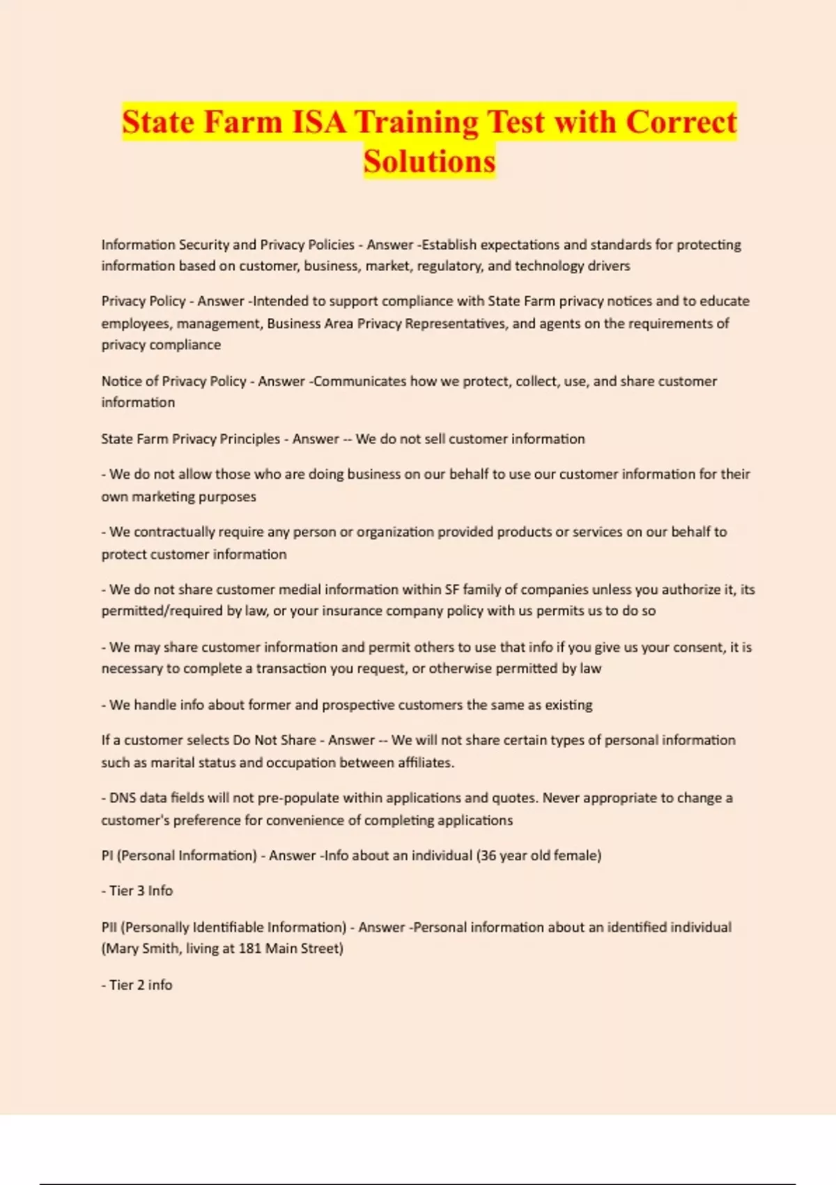 State Farm ISA Training Test with Correct Solutions Information Security and Privacy Policies - Answer -Establish expectations and standards for protecting information based on customer, business, market, regulatory, and technology drivers Privacy Policy - Answer -Intended to support compliance with State Farm privacy notices and to educate employees, management, Business Area Privacy Representatives, and agents on the requirements of privacy compliance Notice of Privacy Policy - Answer -Communicates how we protect, collect, use, and share customer information State Farm Privacy Principles - Answer -- We do not sell customer information - We do not allow those who are doing business on our behalf to use our customer information for their own marketing purposes - We contractually require any person or organization provided products or services on our behalf to protect customer information - We do not share customer medial information within SF family of companies unless you authorize it, its permitted/required by law, or your insurance company policy with us permits us to do so - We may share customer information and permit others to use that info if you give us your consent, it is necessary to complete a transaction you request, or otherwise permitted by law - We handle info about former and prospective customers the same as existing If a customer selects Do Not Share - Answer -- We will not share certain types of personal information such as marital status and occupation between affiliates. - DNS data fields will not pre-populate within applications and quotes. Never appropriate to change a customer's preference for convenience of completing applications PI (Personal Information) - Answer -Info about an individual (36 year old female) - Tier 3 Info PII (Personally Identifiable Information) - Answer -Personal information about an identified individual (Mary Smith, living