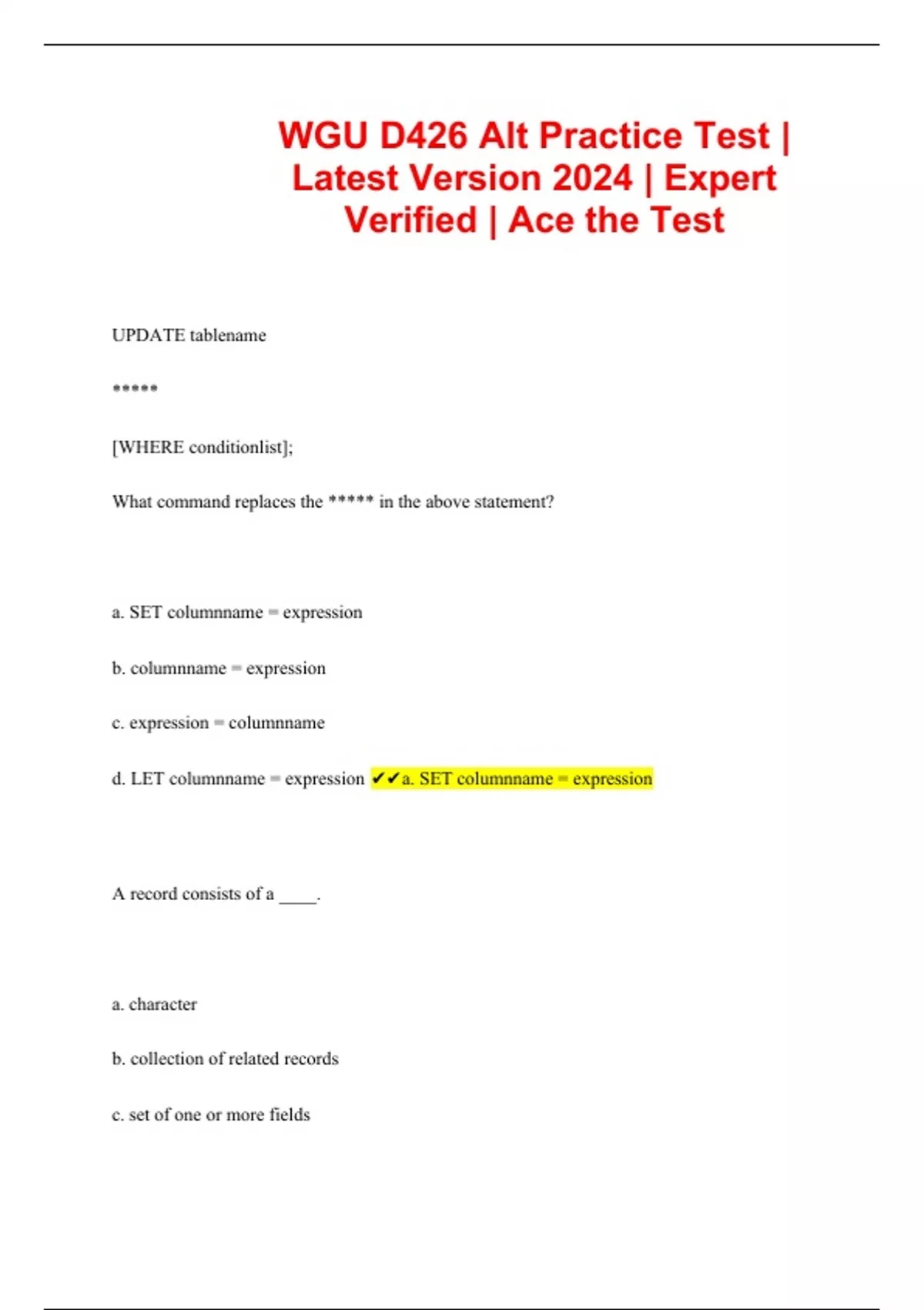 UPDATE tablename ***** [WHERE conditionlist]; What command replaces the ***** in the above statement? a. SET columnname = expression b. columnname = expression c. expression = columnname d. LET columnname = expression a. SET columnname = expression A record consists of a