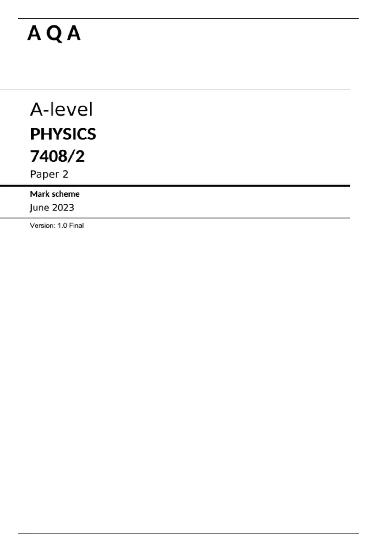A Q A A-level PHYSICS 7408/2 Paper 2 Mark scheme June 2023