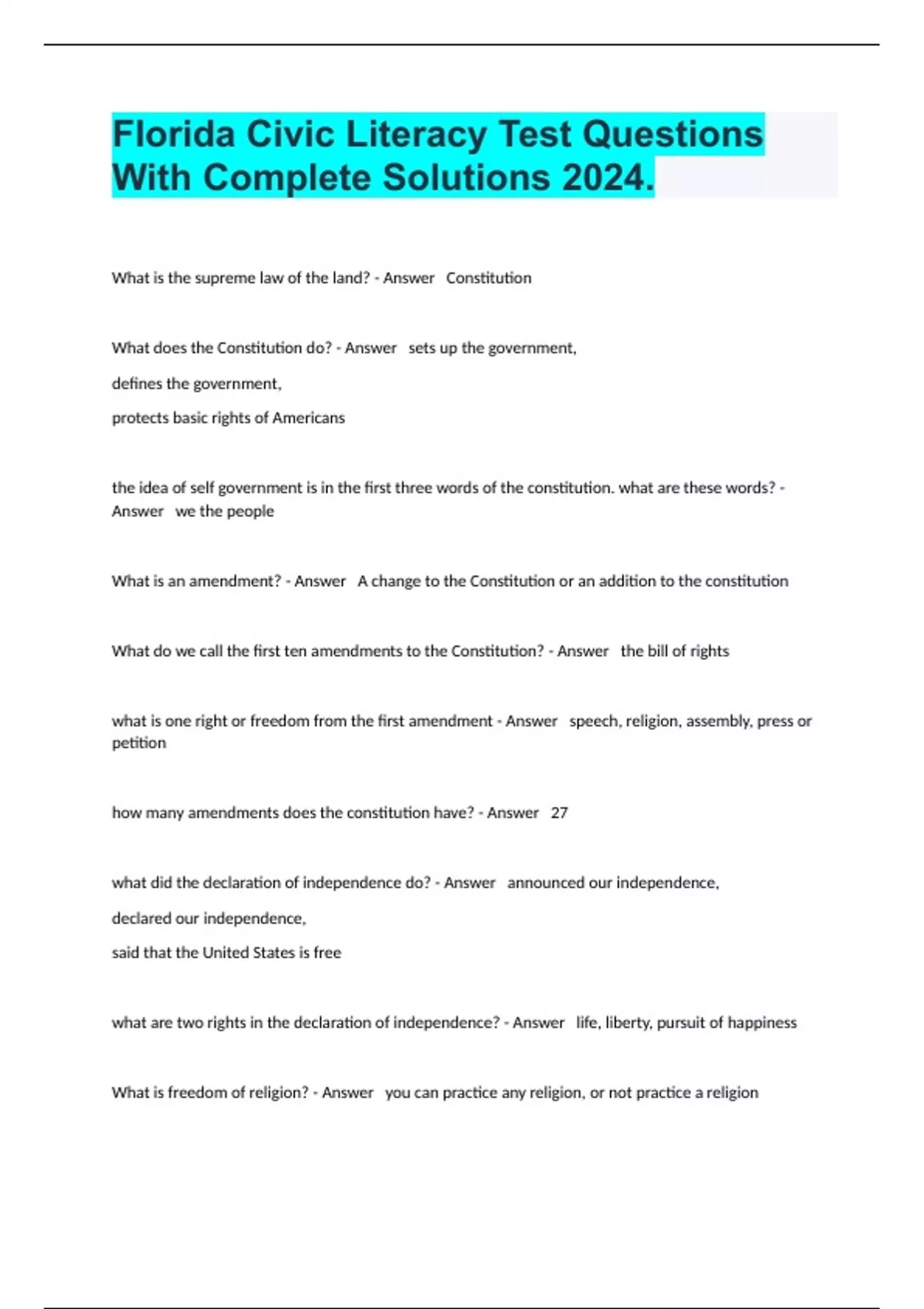 Florida Civic Literacy Test Questions With Complete Solutions 2024.
