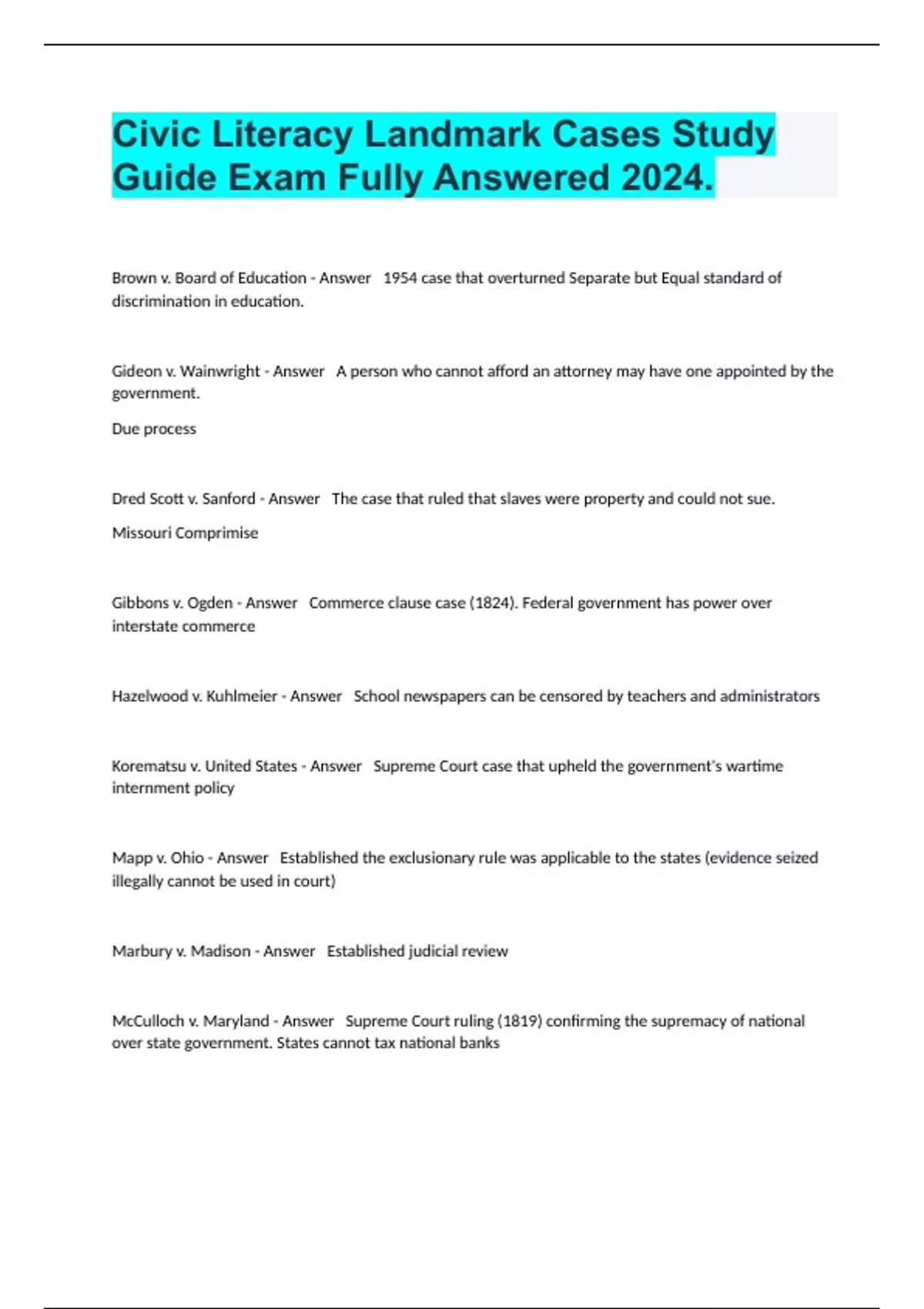 Civic Literacy Landmark Cases Study Guide Exam Fully Answered 2024.