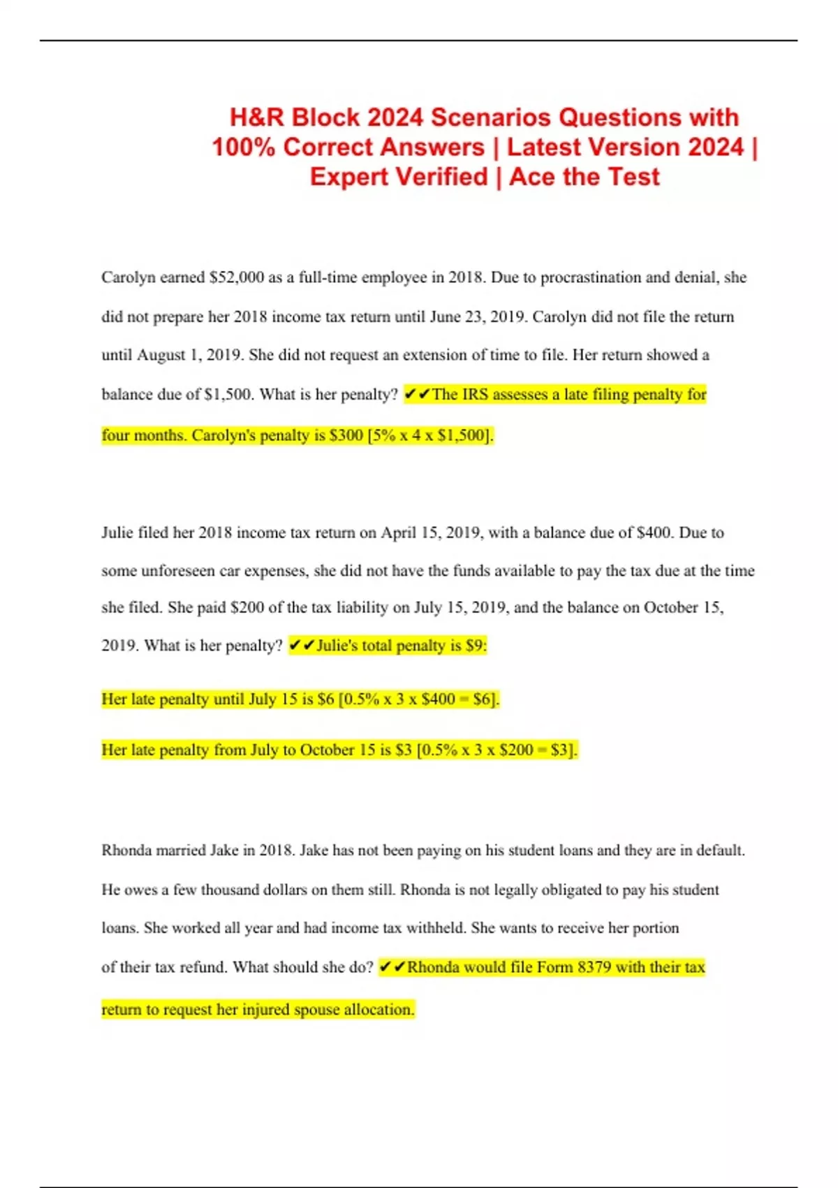 H&R Block 2024 Scenarios Questions with 100% Correct Answers | Latest Version 2024 | Expert Verified | Ace the Test