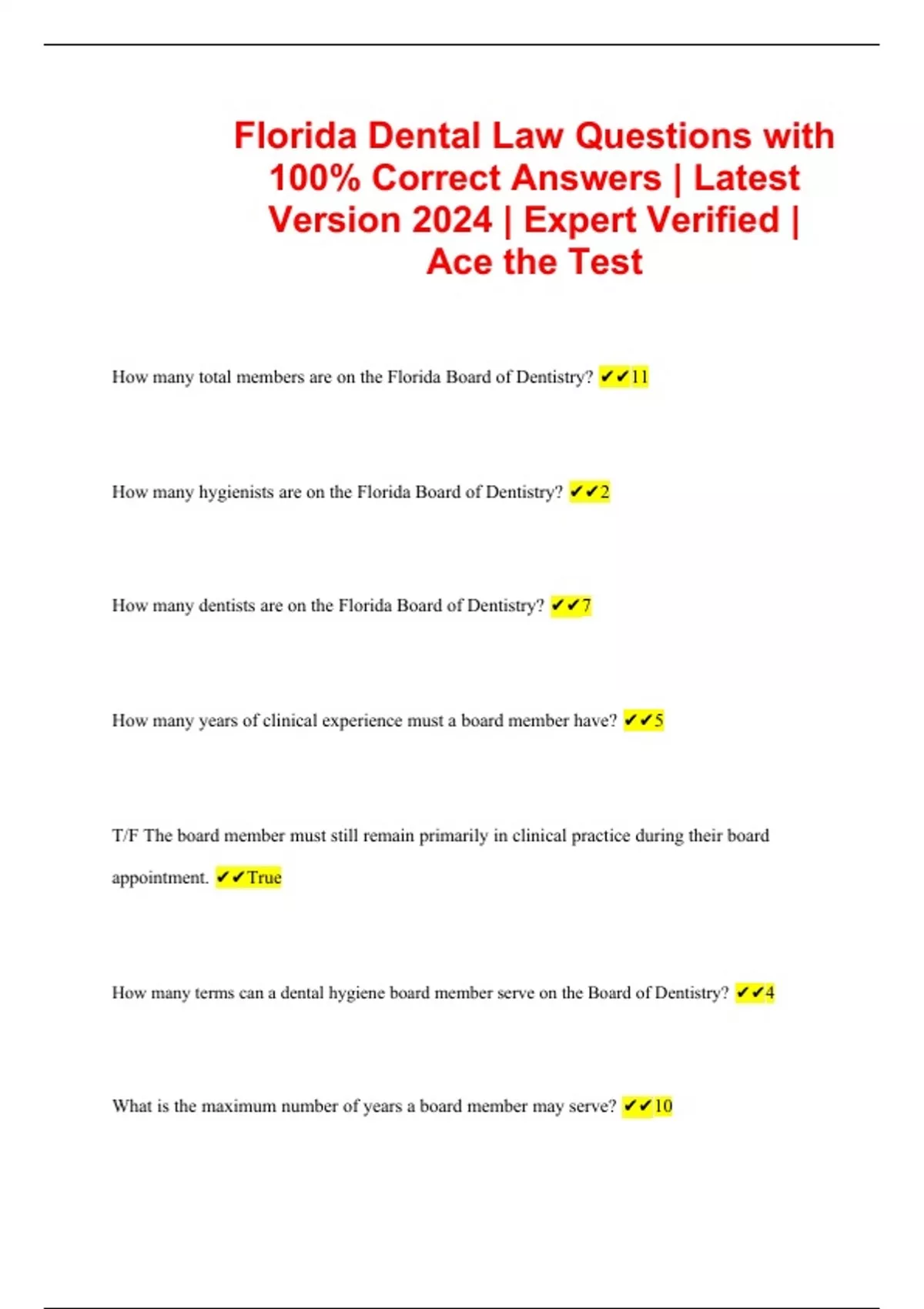 Florida Dental Law Questions with 100% Correct Answers | Latest Version 2024 | Expert Verified | Ace the Test