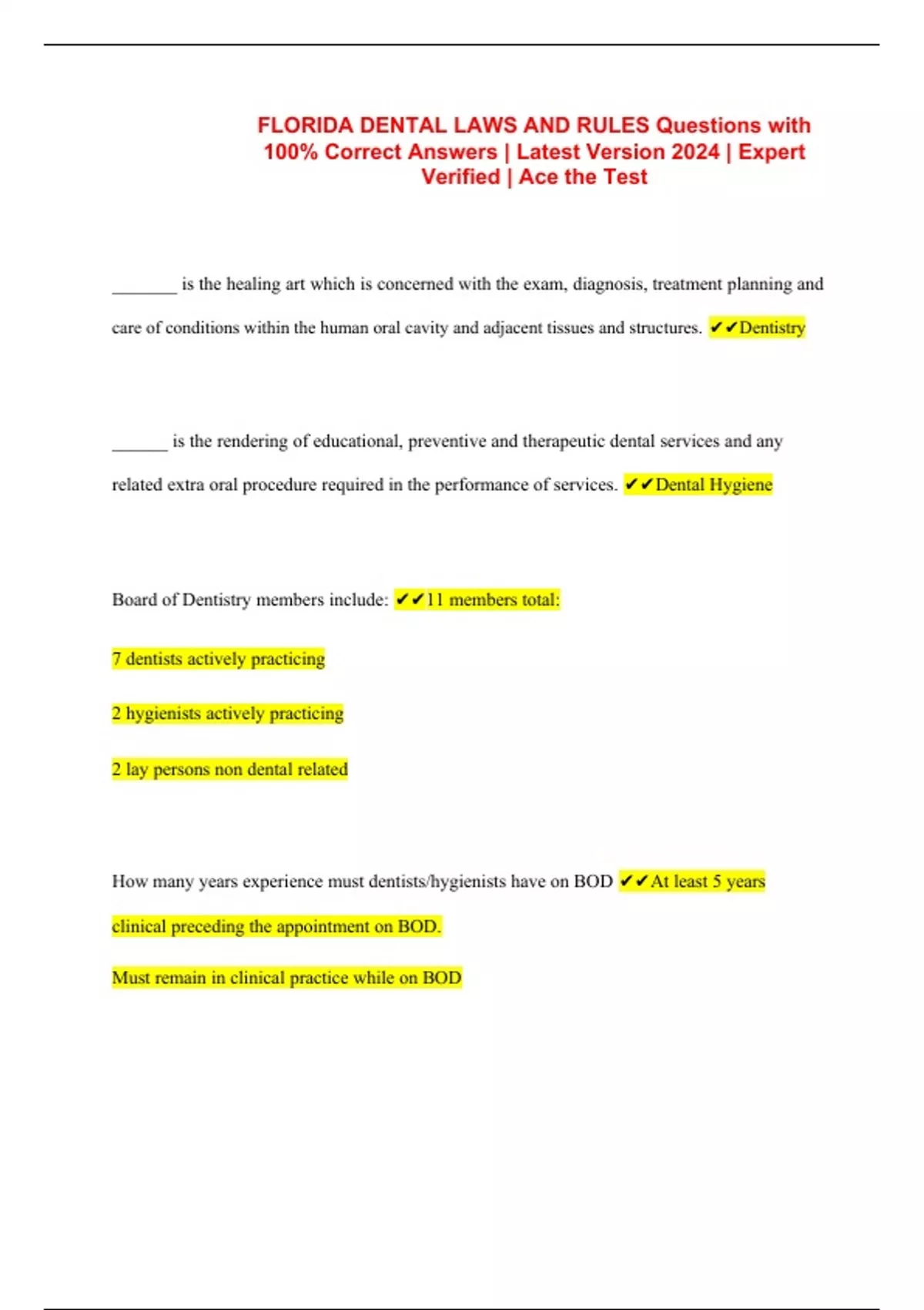 FLORIDA DENTAL LAWS AND RULES Questions with 100% Correct Answers | Latest Version 2024 | Expert Verified | Ace the Test