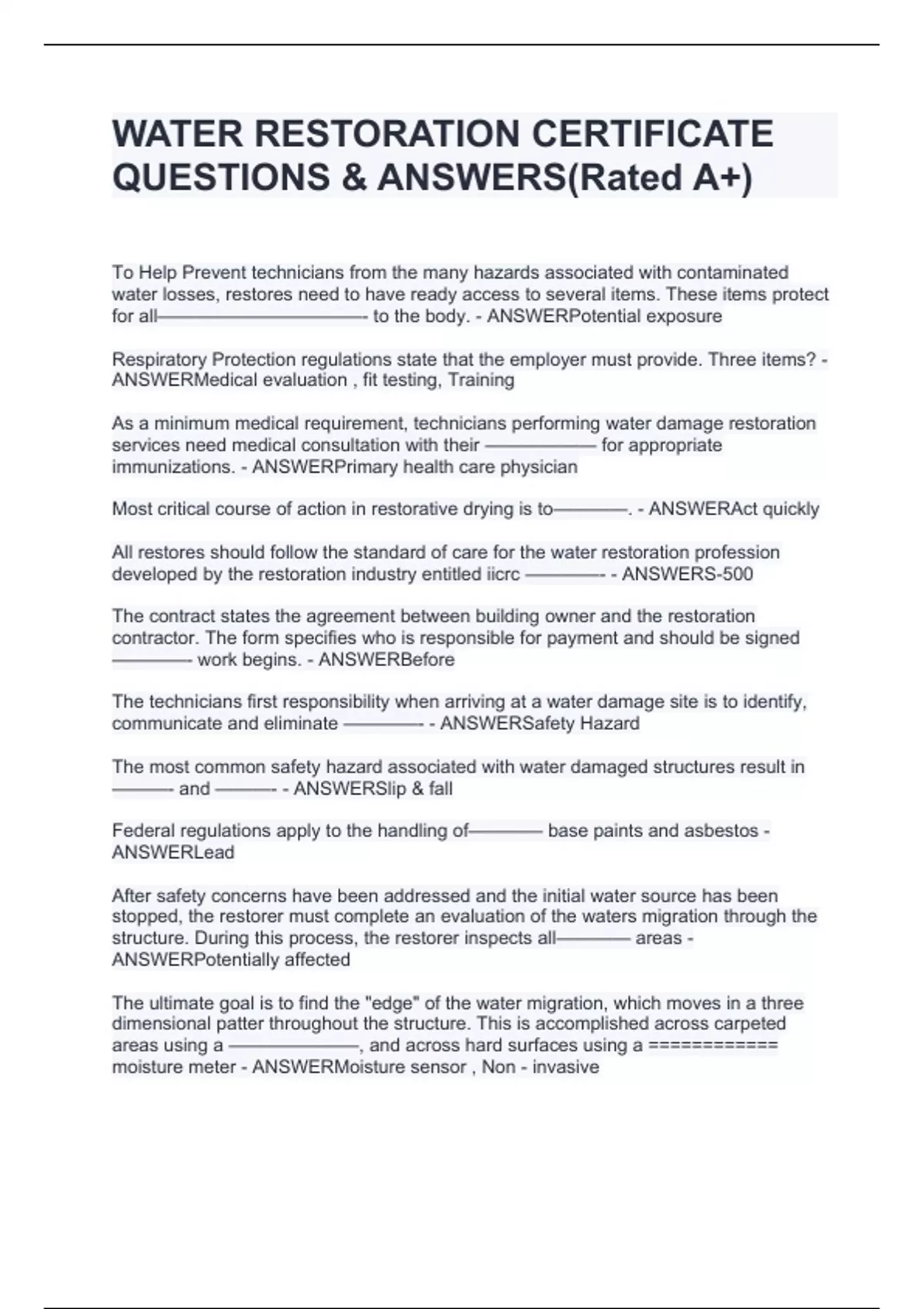 WATER RESTORATION CERTIFICATE QUESTIONS & ANSWERS(Rated A+)
