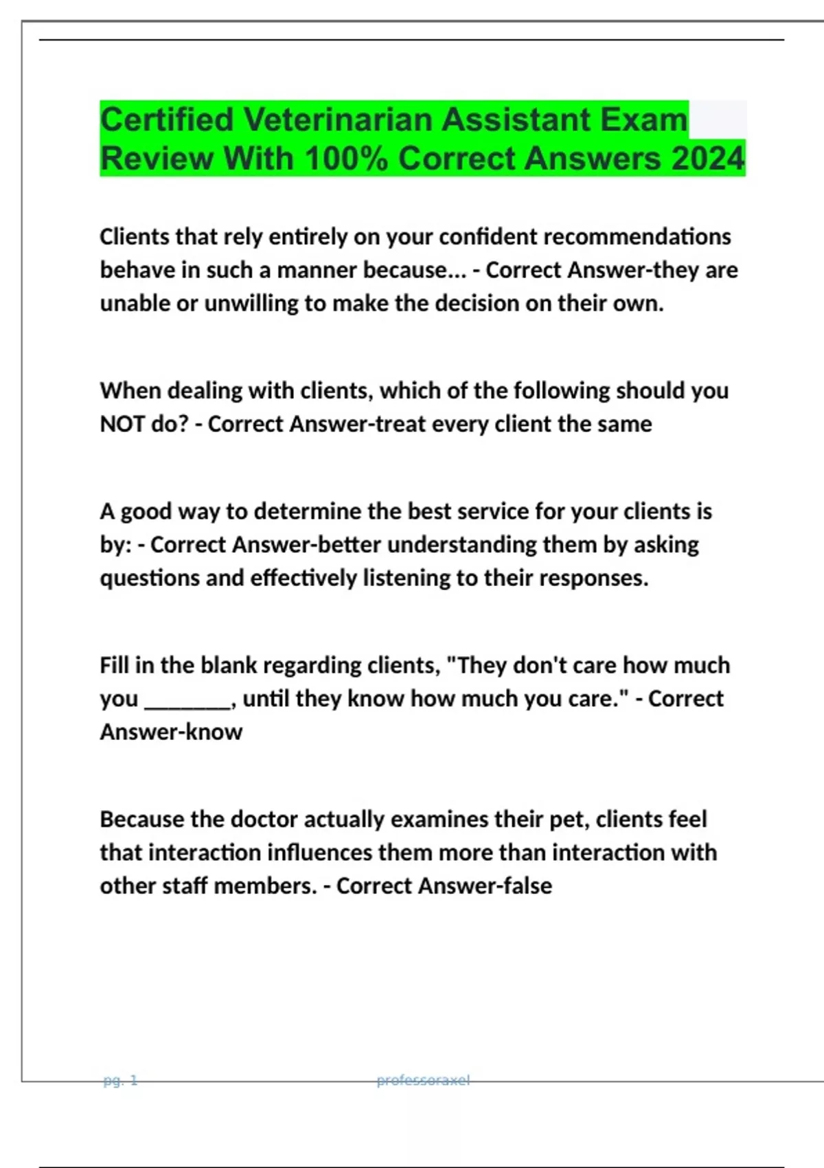 Because the doctor actually examines their pet, clients feel that interaction influences them more than interaction with other staff members. - Correct Answer-false pg. 1 professoraxel What is a client's greatest single expectation with regard to staff? - Correct Answer-keeping your word