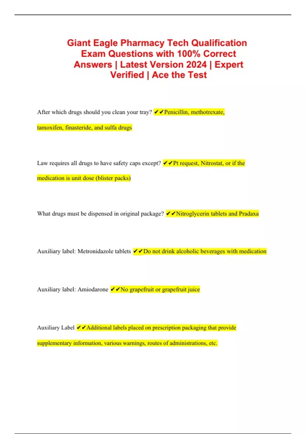 Giant Eagle Pharmacy Tech Qualification Exam Questions with 100% Correct Answers | Latest Version 2024 | Expert Verified | Ace the Test