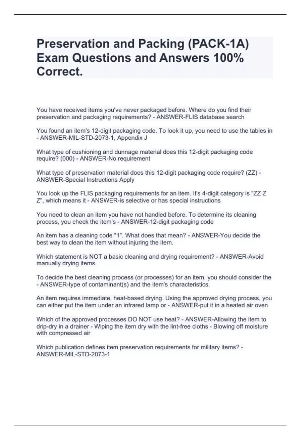 You have received items you've never packaged before. Where do you find their preservation and packaging requirements? - ANSWER-FLIS database search You found an item's 12-digit packaging code. To look it up, you need to use the tables in - ANSWER-MIL-STD-2073-1, Appendix J What type of cushioning and dunnage material does this 12-digit packaging code require? (000) - ANSWER-No requirement What type of preservation material does this 12-digit packaging code require? (ZZ) - ANSWER-Special Instructions Apply You look up the FLIS packaging requirements for an item. It's 4-digit category is "ZZ Z Z", which means it - ANSWER-is selective or has special instructions You need to clean an item you have not handled before. To determine its cleaning process, you check the item's - ANSWER-12-digit packaging code An item has a cleaning code "1". What does that mean? - ANSWER-You decide the best way to clean the item without injuring the item. Which statement is NOT a basic cleaning and drying requirement? - ANSWER-Avoid manually drying items. To decide the best cleaning process (or processes) for an item, you should consider the - ANSWER-type of contaminant(s) and the item's characteristics. An item requires immediate, heat-based drying. Using the approved drying process, you can either put the item under an infrared lamp or - ANSWER-put it in a heated air oven Which of the approved processes DO NOT use heat? - ANSWER-Allowing the item to drip-dry in a drainer - Wiping the item dry with the lint-free cloths - Blowing off moisture with compressed air Which publication defines item preservation requirements for military items? - ANSWER-MIL-STD-2073-1 Where would you go to find out which preservative material this item requires? - ANSWER-MIL-STD-2073-1, Table J-III Which type of preservative releases vapors that form an invisible protective film around an item to protect it from corrosion? - ANSWER-Volatile Corrosion Inhibitors (VCI)