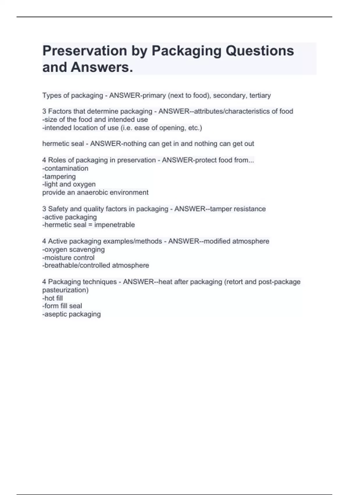 Types of packaging - ANSWER-primary (next to food), secondary, tertiary 3 Factors that determine packaging - ANSWER--attributes/characteristics of food -size of the food and intended use -intended location of use (i.e. ease of opening, etc.) hermetic seal - ANSWER-nothing can get in and nothing can get out 4 Roles of packaging in preservation - ANSWER-protect food from... -contamination -tampering -light and oxygen provide an anaerobic environment 3 Safety and quality factors in packaging - ANSWER--tamper resistance -active packaging -hermetic seal = impenetrable 4 Active packaging examples/methods - ANSWER--modified atmosphere -oxygen scavenging -moisture control -breathable/controlled atmosphere 4 Packaging techniques - ANSWER--heat after packaging (retort and post-package pasteurization) -hot fill -form fill seal -a