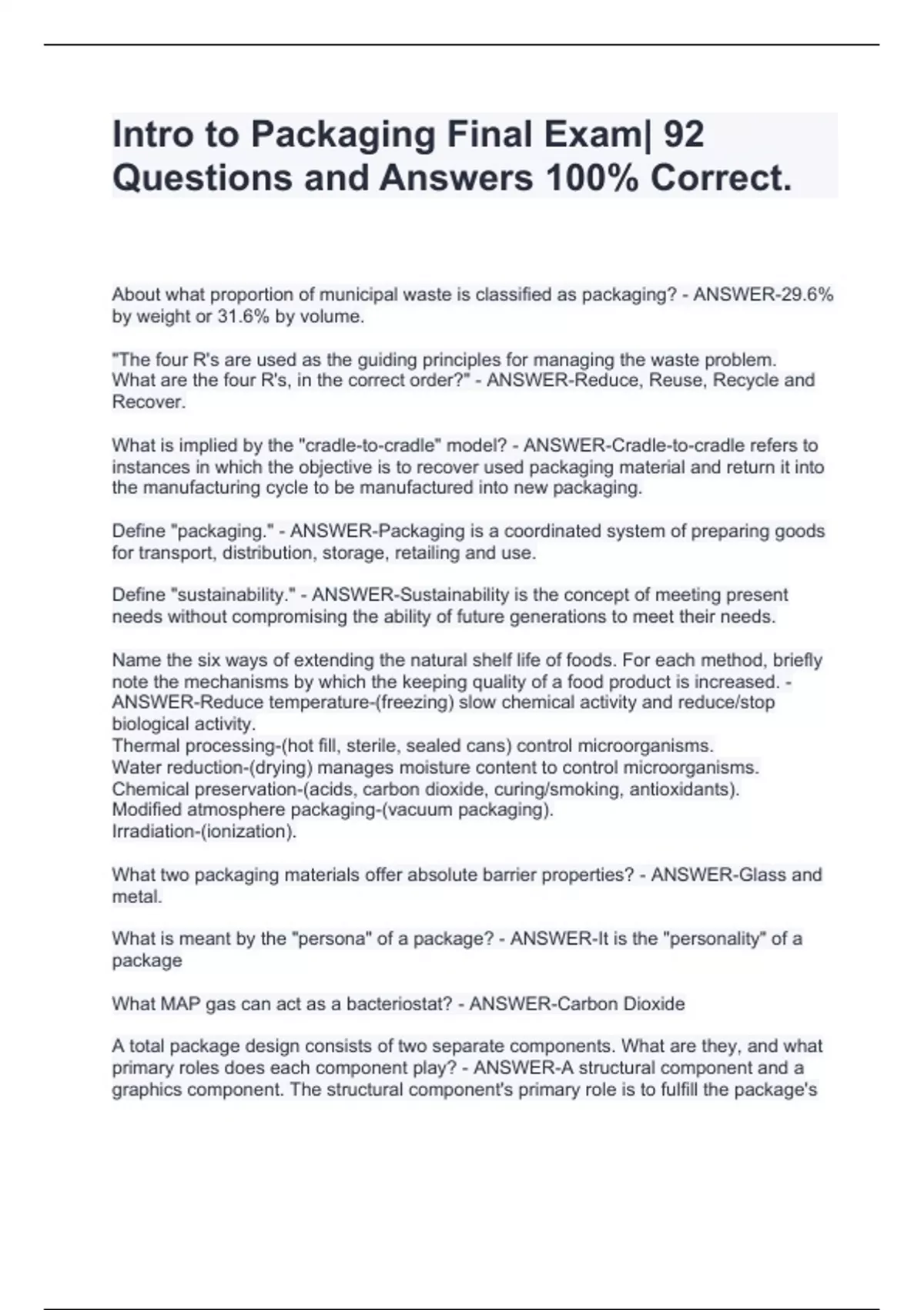 About what proportion of municipal waste is classified as packaging? - ANSWER-29.6% by weight or 31.6% by volume. "The four R's are used as the guiding principles for managing the waste problem. What are the four R's, in the correct order?" - ANSWER-Reduce, Reuse, Recycle and Recover. What is implied by the "cradle-to-cradle" model? - ANSWER-Cradle-to-cradle refers to instances in which the objective is to recover used packaging material and return it into the manufacturing cycle to be manufactured into new packaging. Define "packaging." - ANSWER-Packaging is a coordinated system of preparing goods for transport, distribution, storage, retailing and use. Define "sustainability." - ANSWER-Sustainability is the concept of meeting present needs without compromising the ability of future generations to meet their needs. Name the six ways of extending the natural shelf life of foods. For each method, briefly note the mechanisms by which the keeping quality of a food product is increased. - ANSWER-Reduce temperature-(freezing) slow chemical activity and reduce/stop biological activity. Thermal processing-(hot fill, sterile, sealed cans) control microorganisms. Water reduction-(drying) manages moisture content to control microorganisms. Chemical preservation-(acids, carbon dioxide, curing/smoking, antioxidants). Modified atmosphere packaging-(vacuum packaging). Irradiation-(ionization). What two packaging materials offer absolute barrier properties? - ANSWER-Glass and metal. What is meant by the "persona" of a package? - ANSWER-It is the "personality" of a package What MAP gas can act as a bacteriostat? - ANSWER-Carbon Dioxide