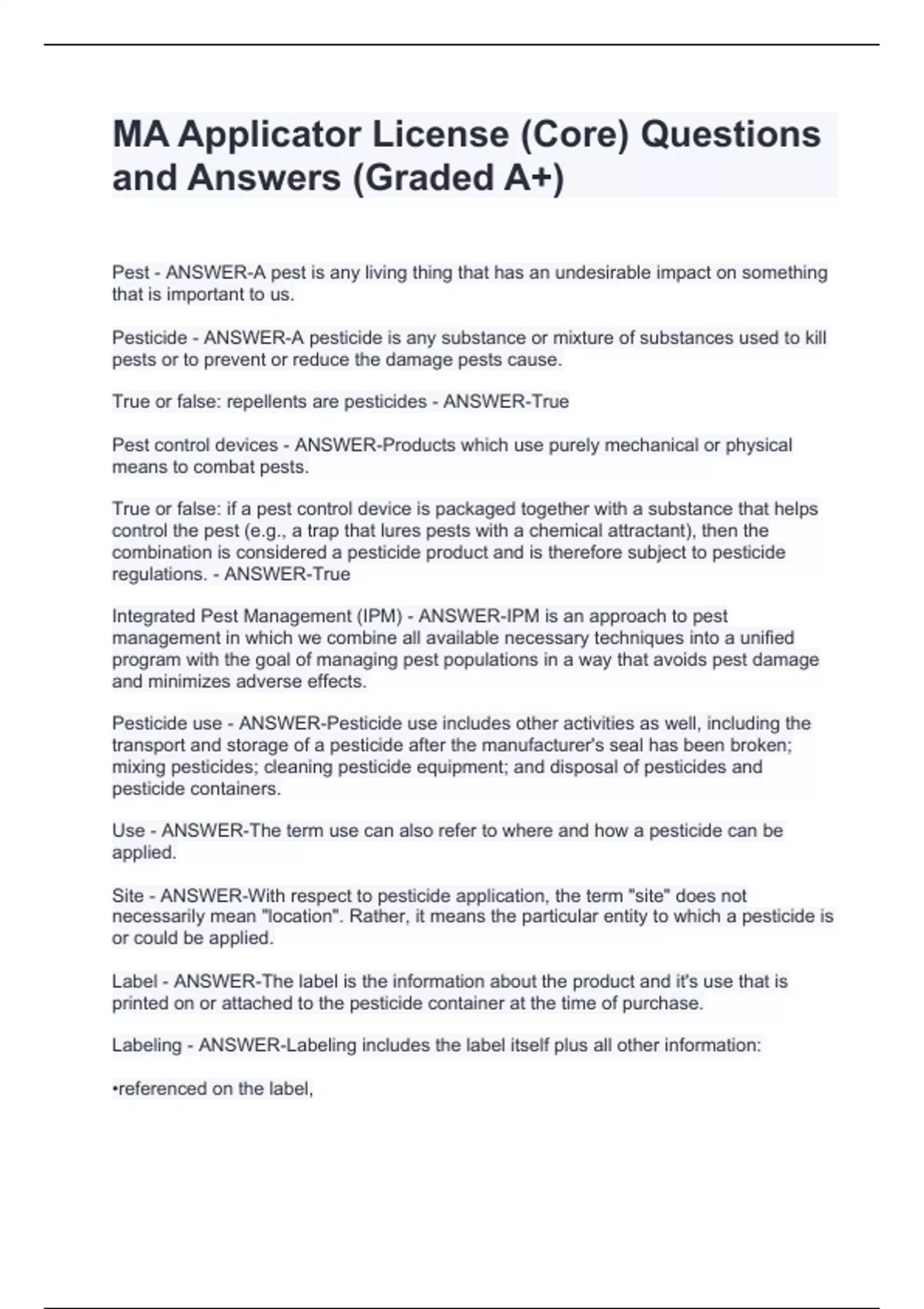 MA Applicator License (Core) Questions and Answers (Graded A+)