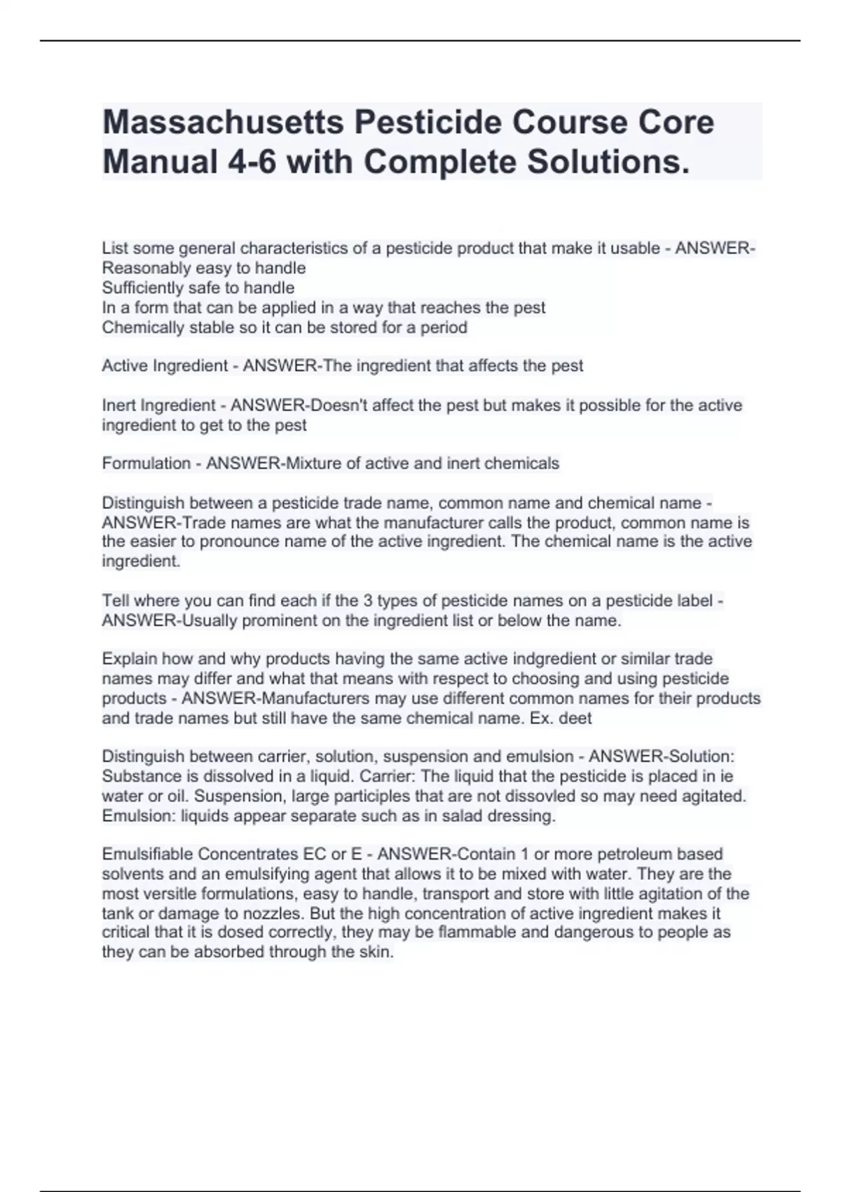 Massachusetts Pesticide Course Core Manual 4-6 with Complete Solutions.