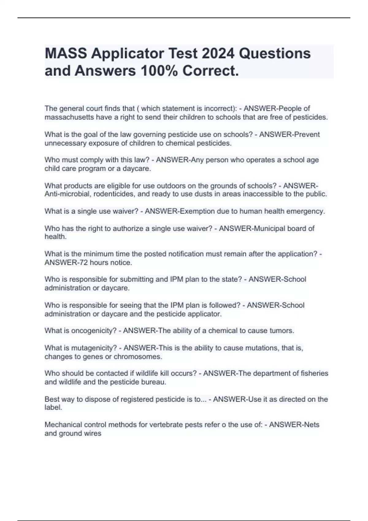The general court finds that ( which statement is incorrect): - ANSWER-People of massachusetts have a right to send their children to schools that are free of pesticides. What is the goal of the law governing pesticide use on schools? - ANSWER-Prevent unnecessary exposure of children to chemical pesticides. Who must comply with this law? - ANSWER-Any person who operates a school age child care program or a daycare. What products are eligible for use outdoors on the grounds of schools? - ANSWER-Anti-microbial, rodenticides, and ready to use dusts in areas inaccessible to the public. What is a single use waiver? - ANSWER-Exemption due to human health emergency. Who has the right to authorize a single use waiver? - ANSWER-Municipal board of health. What is the minimum time the posted notification must remain after the application? - ANSWER-72 hours notice. Who is responsible for submitting and IPM plan to the state? - ANSWER-School administration or daycare. Who is responsible for seeing that the IPM plan is followed? - ANSWER-School administration or daycare and the pesticide applicator. What is oncogenicity? - ANSWER-The ability of a chemical to cause tumors. What is mutagenicity? - ANSWER-This is the ability to cause mutations, that is, changes to genes or chromosomes. Who should be contacted if wildlife kill occurs? - ANSWER-The department of fisheries and wildlife and the pesticide bureau. Best way to dispose of registered pesticide is to... - ANSWER-Use it as directed on the label. Mechanical control methods for vertebrate pests refer o the use of: - ANSWER-Nets and ground wires Ad