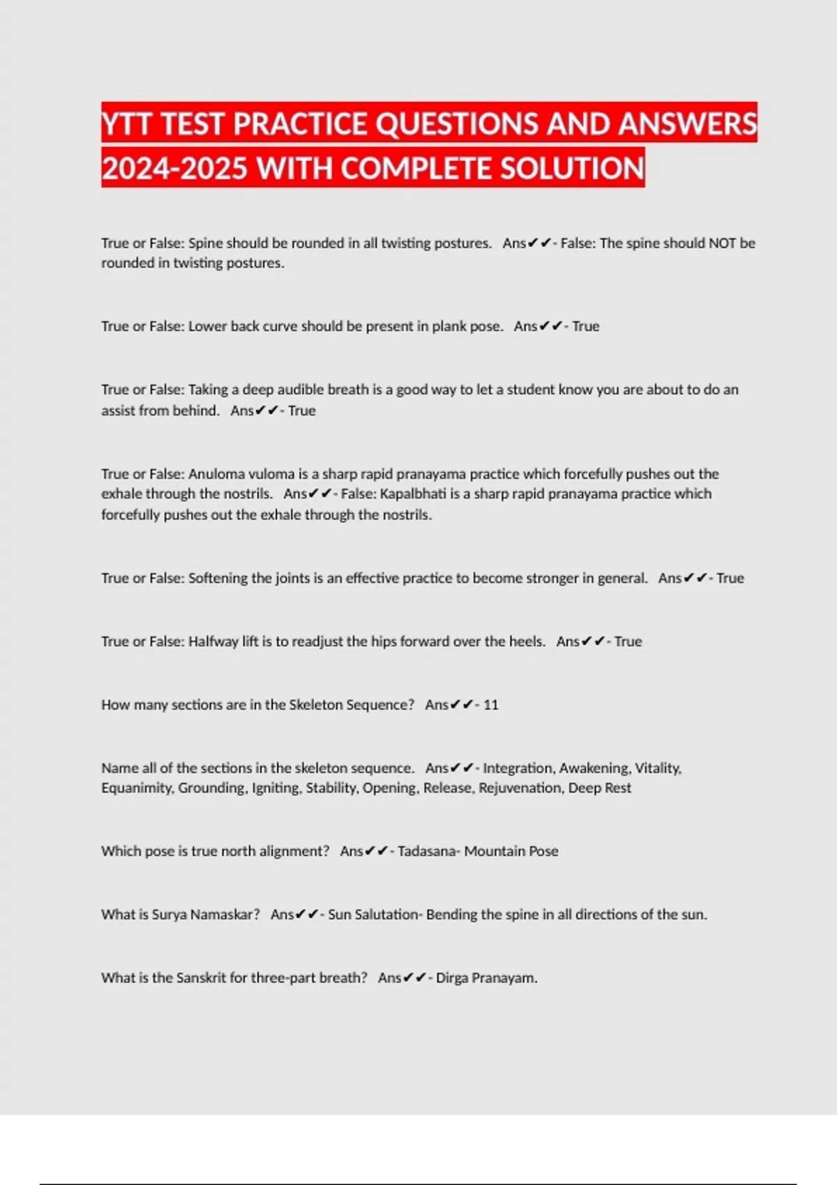 YTT TEST PRACTICE QUESTIONS AND ANSWERS WITH COMPLETE SOLUTION True or False: Spine should be rounded in all twisting postures. Ans- False: The spine should NOT be rounded in twisting postures. True or False: Lower back curve should be present in plank pose. Ans- True True or False: Taking a deep audible breath is a good way to let a student know you are about to do an assist from behind. Ans- True True or False: Anuloma vuloma is a sharp rapid pranayama practice which forcefully pushes out the exhale through the nostrils. Ans- False: Kapalbhati is a sharp rapid pranayama practice which forcefully pushes out the exhale through the nostrils. True or False: Softening the joints is an effective practice to become stronger in general. Ans- True True or False: Halfway lift is to readjust the hips forward over the heels. Ans- True How many sections are in the Skeleton Sequence? Ans- 11 Name all of the sections in the skeleton sequence. Ans- Integration, Awakening, Vitality, Equanimity, Grounding, Igniting, Stability, Opening, Release, Rejuvenation, Deep Rest Which pose is true north alignment? Ans- Tadasana- Mountain Pose What is Surya Namaskar? Ans- Sun Salutation- Bending the spine in all directions of the sun. What is the Sanskrit for three-part breath? Ans- Dirga Pranayam. True or False: In the three-part breath we breathe into the belly first; chest second, and throat last. Ans- True What is another name for Victorious Breath? Ans- Ujjayi Pranayam/ Ocean Breath True or False: Ujjayi is a cooling and controlled breath. Ans- False: Ujjayi is a heating and control breath. What does Kapalbhati translate to? Ans- Skull shining breath - Shining Skull Breath; also know as teh breath of fire. True or False: For Anuloma Viloma you always want to use your left hand for the Vishnu Mudra. Ans- False: You always want to use your right hand for the Vishnu Mudra. What is the ratio count for alternative nostril breathing? Ans- 1:4:2 True or False: Inhale is on an extension, opening, or pose that makes the angle of the body bigger (extends the spine.) Ans- True What portion of the spine has the largest vertebrae and is designed to hold more weight? Ans- Lumbar True or False: The spine when laying down should be flush to the mat. Ans- False: The spine when laying down should still have the lower back space, as well as behind the neck. What are the four categories of assisting? Ans- Deepening, stabilizing, directional, and energetic. What are the nine principles of assisting? Ans- Consent, make yourself known, no open hand, center to center alignment, go in slow/soft and out slow/soft, be comfortable to be there for a good length of time, observe first, make yourself available before class so people can share concerns with you, time up with the breath. True or False: The formula for cues is verb, body part, and specific direction. Ans- True How many vertebrae are in the lumbar spine? Ans- 5 True or False: The lumbar is not made to twist, but is made to bear weight. Ans- True How many bones fuse together at the sacrum? Ans- 5 Why do you shorten your stance in Warrior 1? Ans- To prevent he back leg knee from twisting. What are the five Yamas? Ans- 1. Ahimsa- Nonviolence 2. Satya- Truthfulness 3. Asteya- Nonstealing 4. Brahmacharya- Nonexcess 5. Aparigraha- Nonpossessiveness
