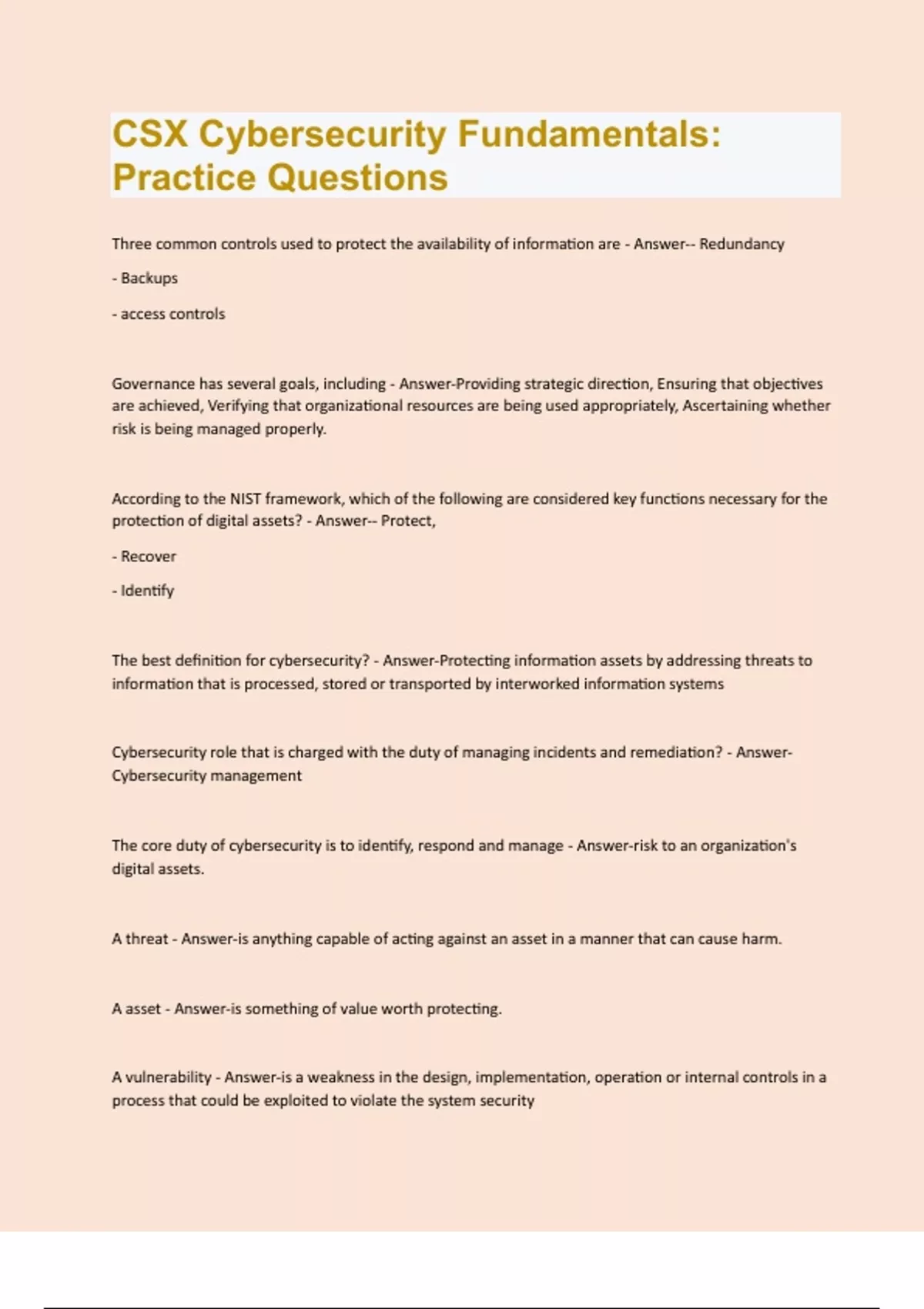 CSX Cybersecurity Fundamentals: Practice Questions And Answers Rated A+ New Update Assured Satisfaction