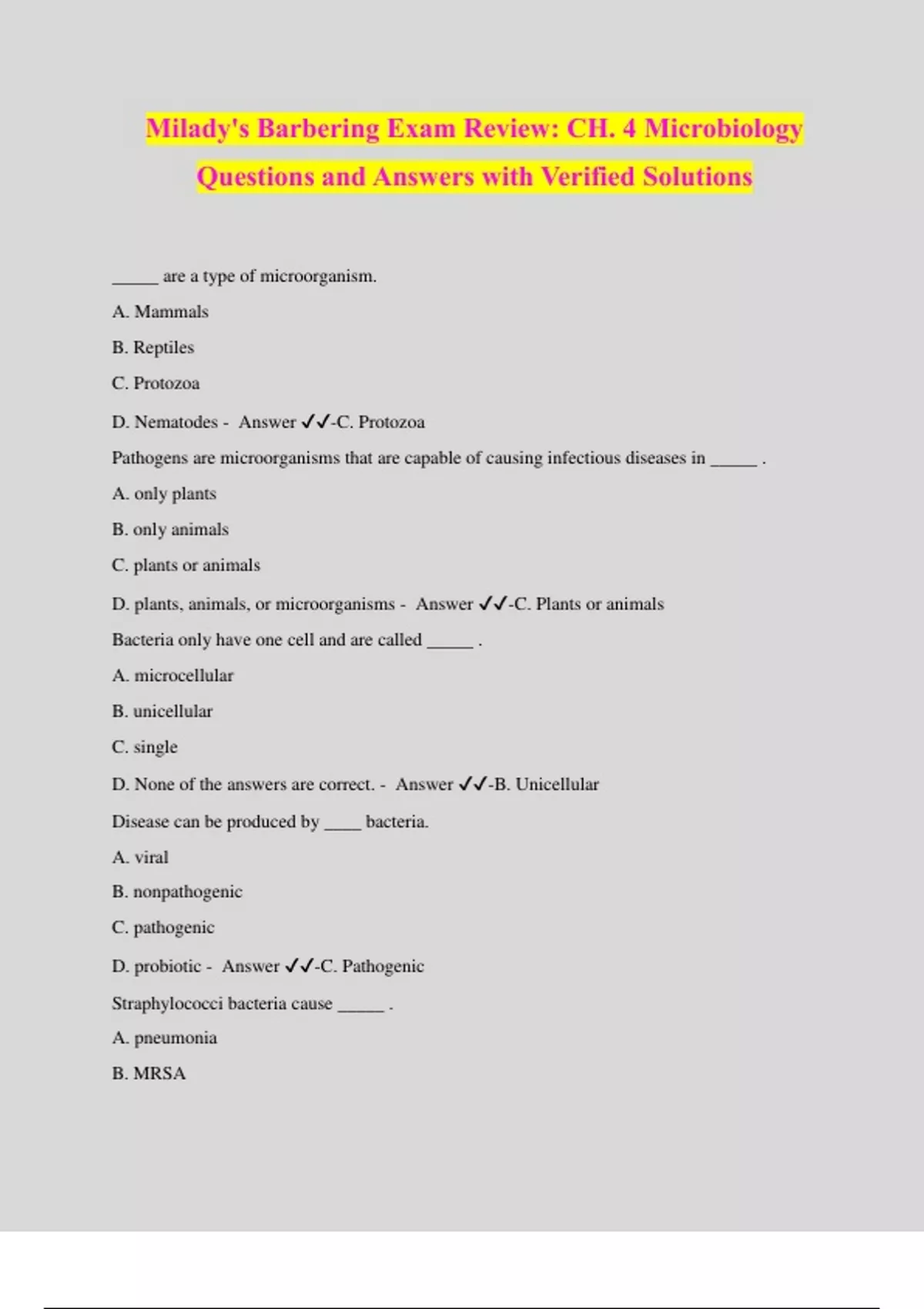 Milady's Barbering Exam Review: CH. 4 Microbiology Questions and Answers with Verified Solutions _____ are a type of microorganism. A. Mammals B. Reptiles C. Protozoa D. Nematodes - Answer ️️ -C. Protozoa Pathogens are microorganisms that are capable of causing infectious diseases in _____ . A. only plants B. only animals C. plants or animals D. plants, animals, or microorganisms - Answer ️️ -C. Plants or animals Bacteria only have one cell and are called _____ . A. microcellular B. unicellular C. single D. None of the answers are correct. - Answer ️️ -B. Unicellular Disease can be produced by ____ bacteria. A. viral B. nonpathogenic C. pathogenic D. probiotic - Answer ️️ -C. Pathogenic Straphylococci bacteria cause _____ . A. pneumonia B. MRSA C. blood poisoning D. gonorrhea - Answer ️️ -B. MRSA Diplococci bacteria ____ and cause pneumonia and gonorrhea. A. grow singly b. grow in pairs C. are rod-shaped d. are curved - Answer ️️ -B. Grow in pairs Cocci bacteria are transmitted by all of the following except _____ . A. active motility B. air C. dust D. water - Answer ️️ -A. Active motility The outer part of a bacterium is the _____ . A. cytoplasm B. spore C. cell wall D. bacilli - Answer ️️ -C. Cell wall Microorganisms multiply well in ____ conditions. A. dry B. warm c. cool D. clean - Answer ️️ -B. Warm During mitosis 16,000,000 microbes can be created by one bacterium in a ____ period. A. 30-second B. 10-minute C. 6-hour D. 12-hour - Answer ️️ -D. 12-hour When the body is unable to cope with ______ , an infectio