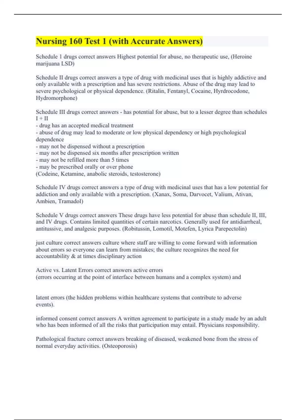 Schedule 1 drugs correct answers Highest potential for abuse, no therapeutic use, (Heroine marijuana LSD) Schedule II drugs correct answers a type of drug with medicinal uses that is highly addictive and only available with a prescription and has severe restrictions. Abuse of the drug may lead to severe psychological or physical dependence. (Ritalin, Fentanyl, Cocaine, Hyrdrocodone, Hydromorphone) Schedule III drugs correct answers - has potential for abuse, but to a lesser degree than schedules I + II - drug has an accepted medical treatment - abuse of drug may lead to moderate or low physical dependency or high psychological dependence - may not be dispensed without a prescription - may not be dispensed six months after prescription written - may not be refilled more than 5 times - may be prescribed orally or over phone (Codeine, Ketamine, anabolic steroids, testosterone) Schedule IV drugs correct answers a type of drug with medicinal uses that has a low potential for addiction and only available with a prescription. (Xanax, Soma, Darvocet, Valium, Ativan, Ambien, Tramadol) Schedule V drugs correct answers These drugs have less potential for abuse than schedule II, III, and IV drugs. Contains limited quantities of certain narcotics. Generally used for antidiarrheal, antitussive, and analgesic purposes. (Robitussin, Lomotil, Motefen, Lyrica Parepectolin) just culture correct answers culture where staff are willing to come forward with information about errors so everyone can learn from mistakes; the culture recognizes the need for accountability & at times disciplinary action Active vs. Latent Errors correct answers active errors (errors occurring at the point of interface between humans and a complex system) and latent errors (the hidden problems within healthcare systems that contribute to adverse events). informed consent correct answers A written agreement to participate in a study made by an adult who has been informed of all the risks that participation may entail. Physicians responsibility. Pathological fracture correct answers breaking of diseased, weakened bone from the stress of normal everyday activities. (Osteoporosis)