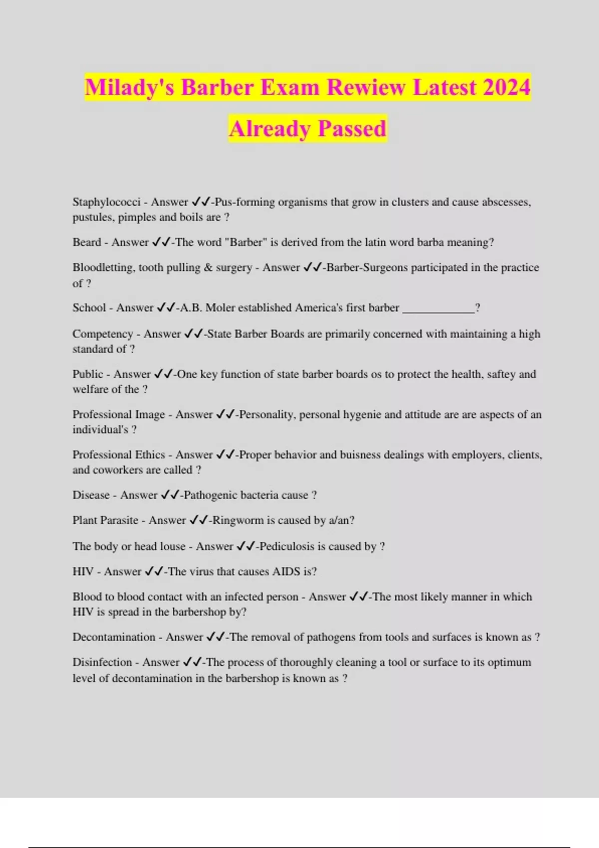 Milady's Barber Exam Rewiew Latest 2024 Already Passed Staphylococci - Answer ️️ -Pus-forming organisms that grow in clusters and cause abscesses, pustules, pimples and boils are ? Beard - Answer ️️ -The word "Barber" is derived from the latin word barba meaning? Bloodletting, tooth pulling & surgery - Answer ️️ -Barber-Surgeons participated in the practice of ? School - Answer ️️ -A.B. Moler established America's first barber ____________? Competency - Answer ️️ -State Barber Boards are primarily concerned with maintaining a high standard of ? Public - Answer ️️ -One key function of state barber boards os to protect the health, saftey and welfare of the ? Professional Image - Answer ️️ -Personality, personal hygenie and attitude are are aspects of an individual's ? Professional Ethics - Answer ️️ -Proper behavior and buisness dealings with employers, clients, and coworkers are called ? Disease - Answer ️️ -Pathogenic bacteria cause ? Plant Parasite - Answer ️️ -Ringworm is caused by a/an? The body or head louse - Answer ️️ -Pediculosis is caused by ? HIV - Answer ️️ -The virus that causes AIDS is? Blood to blood contact with an infected person - Answer ️️ -The most likely manner in which HIV is spread in the barbershop by? Decontamination - Answer ️️ -The removal of pathogens from tools and surfaces is known as ? Disinfection - Answer ️️ -The process of thoroughly cleaning a tool or surface to its optimum level of decontamination in the barbershop is known as ? Disinfection and Sanitation procedures - Answer ️️ -State barber boards and health departments require only ? Hospital grade disinfectant - Answer ️️ -A disinfectant that contains the properties of a bactericide, fungicide, pseudomonacide, virucide, and tuberculocide is considered to be a/an? Skin - Answer ️️ -Antiseptics maybe used on ? 1:1000 - Answer ️️ -For effective sanitization, the minimum strength of a quats solution used to sanitize implements is ? A disinfectant solution - Answer ️️ -A wet sanitizer should contain ? Setting safety standards - Answer ️️ -The Occupational Safety and Health Administration (OSHA) regulates and enforces safety and health in the workplace by ? In a clean closed cabinet - Answer ️️ -Keep clean towels : Before and after serving each clieng - Answer ️️ -Barber's should wash their hands : Avoid solution contamination, Comply with state board rules and comply with sanitation procedures - Answer ️️ -Implements must be cleaned prior to immersion in a disinfectant solution to? Standard precautions - Answer ️️ -When a blood spill occurs, employ: A clean spatula - Answer ️️ -Cream should be removed from jars with : Placed in a closed container - Answer ️️ -Hair or other waste materials on the floor of the barbershop should be : Styptic powder - Answer ️️ -Small nicks or