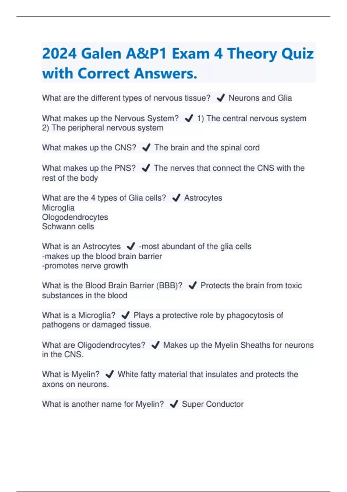 What are the different types of nervous tissue? ️ Neurons and Glia What makes up the Nervous System? ️ 1) The central nervous system 2) The peripheral nervous system What makes up the CNS? ️ The brain and the spinal cord What makes up the PNS? ️ The nerves that connect the CNS with the rest of the body What are the 4 types of Glia cells? ️ Astrocytes Microglia Ologodendrocytes Schwann cells What is an Astrocytes ️ -most abundant of the glia cells -makes up the blood brain barrier -promotes nerve growth What is the Blood Brain Barrier (BBB)? ️ Protects the brain from toxic substances in the blood What is a Microglia? ️ Plays a protective role by phagocytosis of pathogens or damaged tissue. What are Oligodendrocytes? ️ Makes up the Myelin Sheaths for neurons in the CNS. What is Myelin? ️ White fatty material that insulates and protects the axons on neurons. What is another name for Myelin? ️ Super Conductor 2024 Galen A&P1 Exam 4 Theory Quiz with Correct Answers.