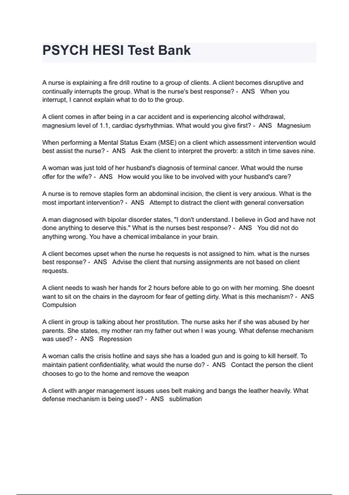 PSYCH HESI Test Bank Questions And Answers A nurse is explaining a fire drill routine to a group of clients. A client becomes disruptive and continually interrupts the group. What is the nurse's best response? - ANS When you interrupt, I cannot explain what to do to the group. A client comes in after being in a car accident and is experiencing alcohol withdrawal, magnesium level of 1.1, cardiac dysrhythmias. What would you give first? - ANS Magnesium When performing a Mental Status Exam (MSE) on a client which assessment intervention would best assist the nurse? - ANS Ask the client to interpret the proverb: a stitch in time saves nine. A woman was just told of her husband's diagnosis of terminal cancer. What would the nurse offer for the wife? - ANS How would you like to be involved with your husband's care? A nurse is to remove staples form an abdominal incision, the client is very anxious. What is the most important intervention? - ANS Attempt to distract the client with general conversation A man diagnosed with bipolar disorder states, "I don't understand. I believe in God and have not