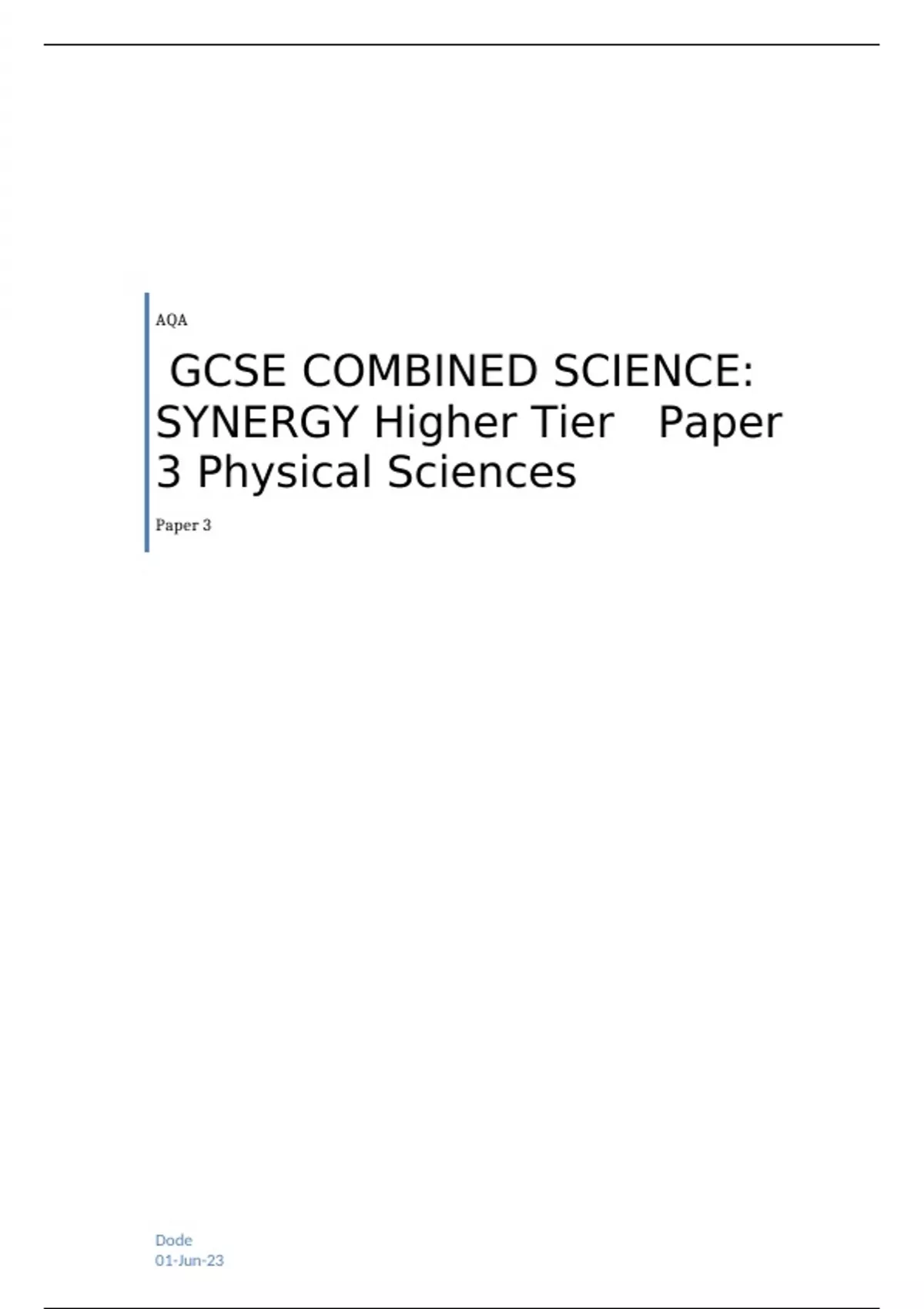 AQA GCSE COMBINED SCIENCE: SYNERGY Higher Tier Paper 3 Physical Sciences QUESTION PAPER FOR JUNE 2023