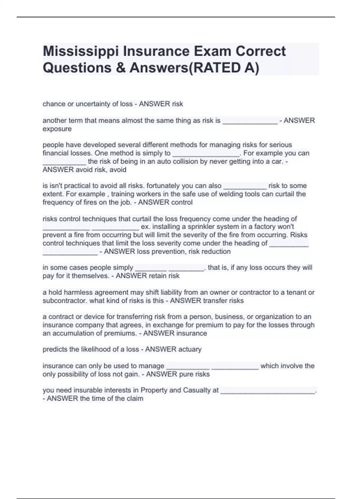 Mississippi Insurance Exam Correct Questions & Answers(RATED A)