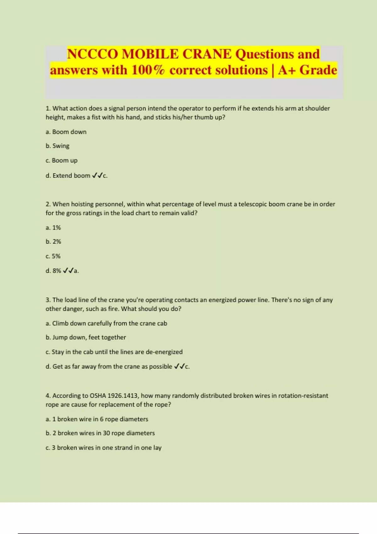 1. What action does a signal person intend the operator to perform if he extends his arm at shoulder height, makes a fist with his hand, and sticks his/her thumb up? a. Boom down b. Swing c. Boom up d. Extend boom c. 2. When hoisting personnel, within what percentage of level must a telescopic boom crane be in order for the gross ratings in the load chart to remain valid? a. 1% b. 2% c. 5% d. 8% a. 3. The load line of the crane you're operating contacts an energized power line. There's no sign of any other danger, such as fire. What should you do? a. Climb down carefully from the crane cab b. Jump down, feet together c. Stay in the cab until the lines are de-energized d. Get as far away from the crane as possible c. 4. According to OSHA 1926.1413, how many randomly distributed broken wires in rotation-resistant rope are cause for replacement of the rope? a. 1 broken wire in 6 rope diameters b. 2 broken wires in 30 rope diameters c. 3 broken wires in one strand in one layd. 2 broken wires in 6 rope diameters d