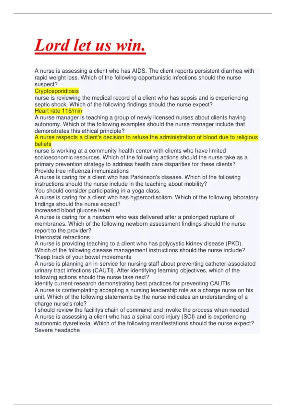 A nurse manager is teaching a group of newly licensed nurses about clients having autonomy. Which of the following examples should the nurse manager include that demonstrates this ethical principle? A nurse respects a client's decision to refuse the administration of blood due to religious beliefs nurse is working at a community health center with clients who have limited socioeconomic resources. Which of the following actions should the nurse take as a primary prevention strategy to address health care disparities for these clients? Provide free influenza immunizations A nurse is caring for a client who has Parkinson's disease. Which of the following instructions should the nurse include in the teaching about mobility? You should consider participating in a yoga class. A nurse is caring for a client who has hypercortisolism. Which of the following laboratory findings should the nurse expect?