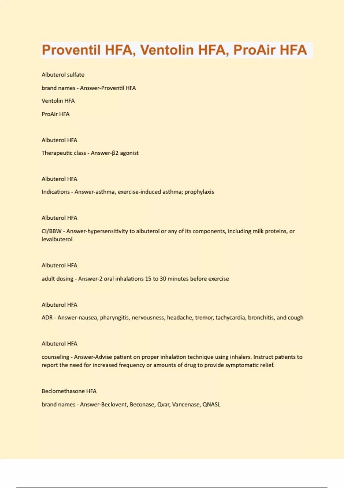 Albuterol sulfate brand names - Answer-Proventil HFA Ventolin HFA ProAir HFA Albuterol HFA Therapeutic class - Answer-β2 agonist Albuterol HFA Indications - Answer-asthma, exercise-induced asthma; prophylaxis Albuterol HFA CI/BBW - Answer-hypersensitivity to albuterol or any of its components, including milk proteins, or levalbuterol Albuterol HFA adult dosing - Answer-2 oral inhalations 15 to 30 minutes before exercise Albuterol HFA ADR - Answer-nausea, pharyngitis, nervousness, headache, tremor, tachycardia, bronchitis, and cough Albuterol HFA counseling - Answer-Advise patient on proper inhalation technique using inhalers. Instruct patients to report the need for increased frequency or amounts of drug to provide symptomatic relief. Beclomethasone HFA brand names - Answer-Beclovent, Beconase, Qvar, Vancenase, QNASLBeclomethasone HFA therapeutic class - Answer-Inhaled corticosteroid Beclomethasone HFA indications - Answer-Asthma, Nasal polyp, Rhinitis Beclomethasone HFA CI/BBW - Answer-Hypersensitivity to beclomethasone or any other product component, Status asthmaticus (primary treatment, oral inhaltion), Acute ashma episodes requiring intensive measures (oral inhalation) Beclomethasone HFA adult dosing - Answer-Asthma(previously treated with bronchodilators alone): initial, 40 to 80 mcg twice a day; MAX 320 mcg twice daily. Asthma (previously treated with inhaled corticosteroids): initial, 40 to 160 mcg twice daily; MAX 320 mcg twice daily Beclomethasone HFA ADR - Answer-Common: Headache, Pharyngitis Severe: Secondary hypocortisolism, Cataract, Glaucoma Beclomethasone HFA counseling - Answer-Counsel patient to avoid vaccines during therapy, unless approved by healthcare provider. Advise patients with asthma that drug is only used for prevention and will not stop an asthma attack. Advise patient against sudden discontinuation of drug. Instruct patients using the inhaler to rinse out their mouth with water after each use to prevent localized oral infections. Fluticasone propionate nasal spray - Answer-Cutivate, Flonase, Flovent, Flovent Rotadisk, Flovent HFA, Flovent Diskus Fluticasone propionate nasal spraytherapeutic class - Answer-Nasal corticosteroid Fluticasone propionate nasal spray indications - Answer-Allergic rhinitis, Asthma, Atopic dermatitis, Disorder of skin (corticosteroidresponsive dermatoses), Rhinitis (non-allergic) Fluticasone propionate nasal spray CI/BBW - Answer-Hypersensitivity to any component of the product, hypersensitivity to milk proteins, severe (oral inhalation). Primary treatment of status asthmaticus or other acute episodes of asthma requiring intesnive intervention (oral inhalation) Fluticasone propionate nasal spray adult dosing - Answer-Initial, 2 sprays/nostril daily or 1 spray/nostril twice daily, MAX 2 sprays/nostril/day (200 mcg/day) Fluticasone propionate nasal spray ADR - Answer-Common: Headache, cough, epistaxis. Fluticasone propionate nasal spray counseling - Answer-Advise patient that this drug is not indicated for acute asthma attacks. Report signs/symptoms of adrenal supression or hypercortisolism (weight gain, fatigue, muscle weakness, facial rounding; fragile/thin skin) Fluticasone HFA brand names - Answer-Flovent HFA, Flonase, Cutivate, Flovent Fluticasone HFA therapeutic class - Answer-Inhaled corticosteroid Fluticasone HFA indications - Answer-Allergic rhinitis, Asthma, Rhinitis (non-allergic)Fluticasone HFA CI/BBW - Answer-Hypersensitivity to any component of the product Primary treatment of status asthmaticus or other acute episodes of asthma requiring intensive intervention Severe hypersensitivity to milk proteins " Fluticasone HFA adult dosing - Answer-Allergic Rhintis: NASAL INHALATION, initial, 2 sprays/nostril daily or 1 spray/nostril twice daily, MAX 2 sprays/nostril/day (200 mcg/day) For Asthma: (Aerosol) Initial dose, previous therapy with inhaled bronchodilators alone: 88 mcg via oral inhalation twice daily; MAX 440 mcg twice daily For Nasal Polyp: 200 or 400 mcg INTRANASSALY once or twice a day. For Non-Allergic Rhinits: NASAL INHALATION, initial, 2 sprays/nostril daily or 1 spray/nostril twice daily, MAX 2 sprays/nostril/day (200 mcg/day)" Fluticasone HFA ADR - Answer-Candidiasis of mouth and esophagus, Nausea and vomiting, Osteoporosis, Headache, Cough, Epistaxis, Pharyngitis, Sinusitis, Throat irritation, Upper respiratory infection Fluticasone HFA counseling - Answer-Advise patient that this drug is not indicated for acute asthma attacks. This drug may cause pharyngeal candidiasis, epistaxis, or pharyngitis.Advise patient that symptomatic improvement may not be seen for a few weeks. Report signs/symptoms of systemic corticosteroid effects such as adrenal suppression or hypercortisolism, or signs/symptoms of infection. Caregivers of pediatric patients using inhaled form should monitor for and report decreased growth. Patient should rinse mouth with water and spit following inhalation. Advise patient on proper inhalation technique. Patients using the topical formulation should not use occlusive dressings over application site. Patients using the topical formulation should not apply drug to face, underarms, groin, or diaper area" Levalbuterol brand names - Answer-Xopenex, Xopenex Pediatric Levalbuterol therapeutic class - Answer-Beta 2 Agonist Levalbuterol indications - Answer-Asthma Levalbuterol CI/BBW - Answer-Hypersensitivity to racemic albuterol or levalbuterol products Levalbuterol adult dosing - Answer-Acute asthma exacerbation) 1.25 to 2.5 mg ORAL INHALATION every 20 minutes for 3 doses, then 1.25 to 5 mg every 1 to 4 hours as neededBronchospasm -- 0.63 to 1.25 mg nebulized solution ORAL INHALATION 3 times/day (every 6 to 8 hours) as needed Levalbuterol ADR - Answer-Rash, Diarrhea, Tremor, Asthma, Rhinitis, Viral disease, Accidental injury, Fever Levalbuterol counseling - Answer-Advise patient to immediately withdraw therapy if paradoxical bronchospasm occurs Counsel patient to report any hypersensitivity reactions t