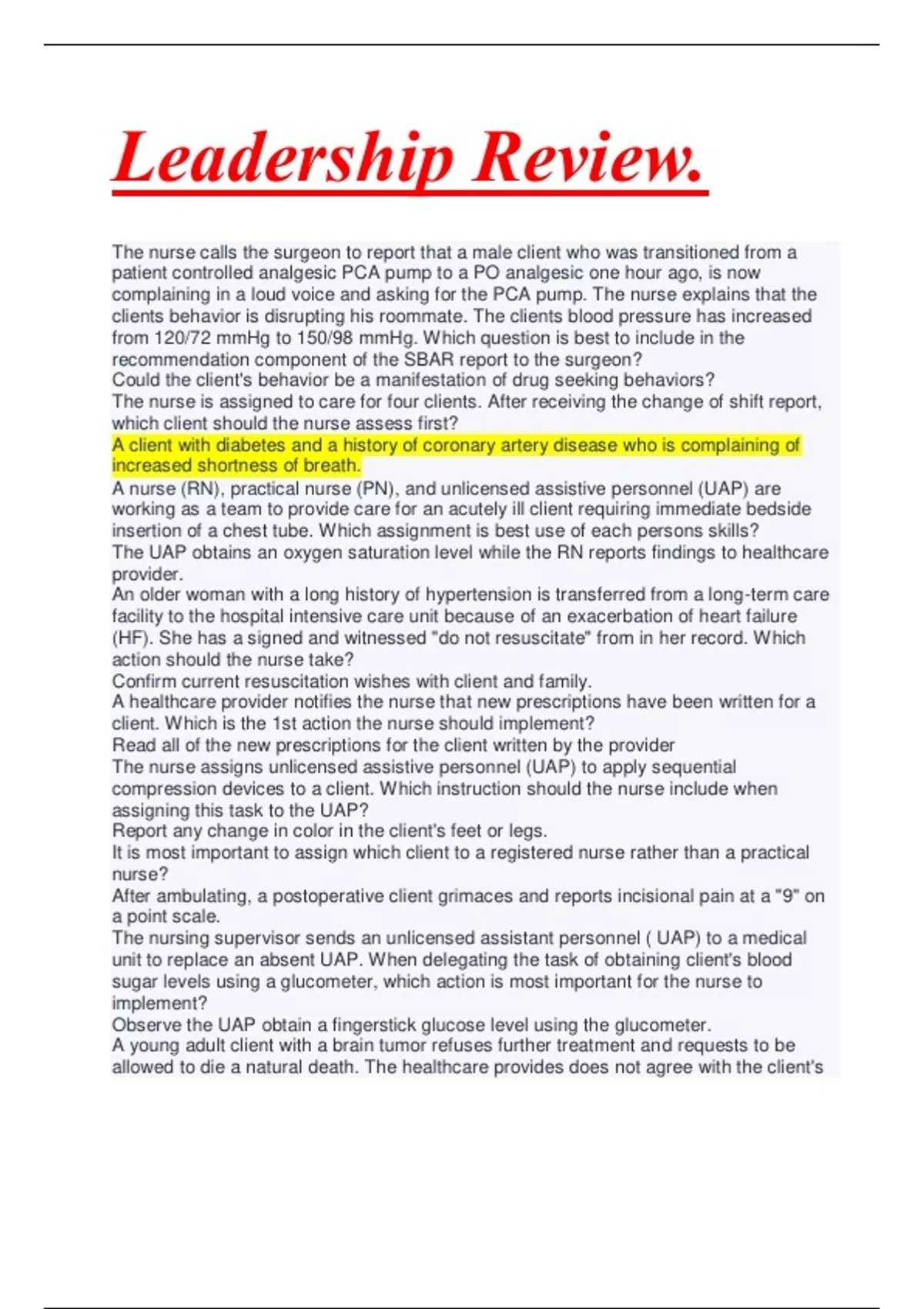 A client with diabetes and a history of coronary artery disease who is complaining of increased shortness of breath. A nurse (RN), practical nurse (PN), and unlicensed assistive personnel (UAP) are working as a team to provide care for an acutely ill client requiring immediate bedside insertion of a chest tube. Which assignment is best use of each persons skills? The UAP obtains an oxygen saturation level while the RN reports findings to healthcare provider. An older woman with a long history of hypertension is transferred from a long-term care facility to the hospital intensive care unit because of an exacerbation of heart failure (HF). She has a signed and witnessed "do not resuscitate" from in her record. Which action should the nurse take? Confirm current resuscitation wishes with client and family. A healthcare provider notifies the nurse that new prescriptions have been written for a client. Which is the 1st action the nurse should implement? Read all of the new prescriptions for the client written by the provider The nurse assigns unlicensed assistive personnel (UAP) to apply sequential compression devices to a client. Which instruction should the nurse include when assigning this task to the UAP? Report any change in color in the client's feet or legs. It is most important to assign which client to a registered nurse rather than a practical nurse? After ambulating, a postoperative client grimaces and reports incisional pain at a "9" on a point scale.