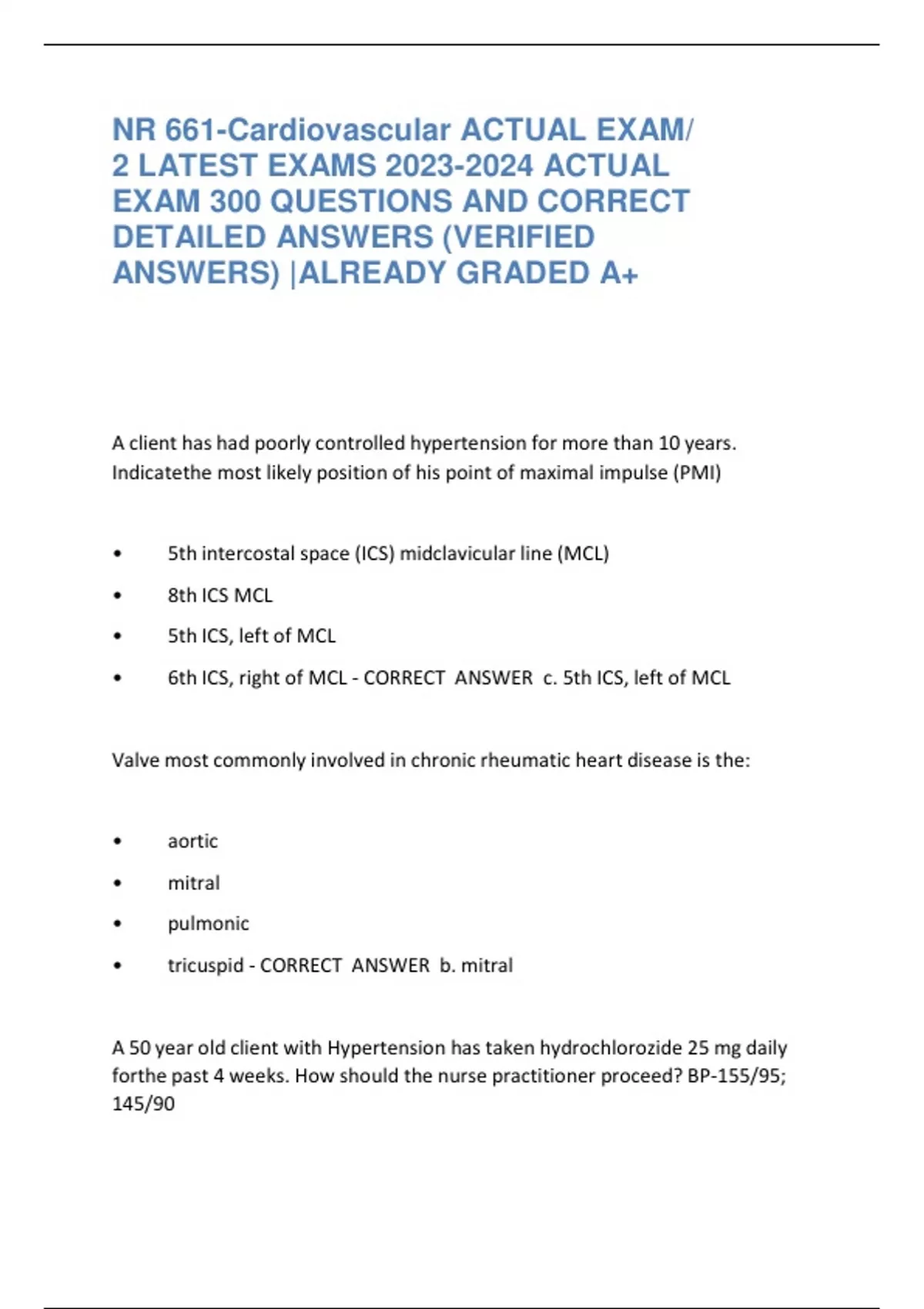 NR 661-Cardiovascular ACTUAL EXAM 2 LATEST EXAMS ACTUAL EXAM 300 QUESTIONS AND CORRECT DETAILED ANSWERS (VERIFIED ANSWERS) ALREADY GRADED A+