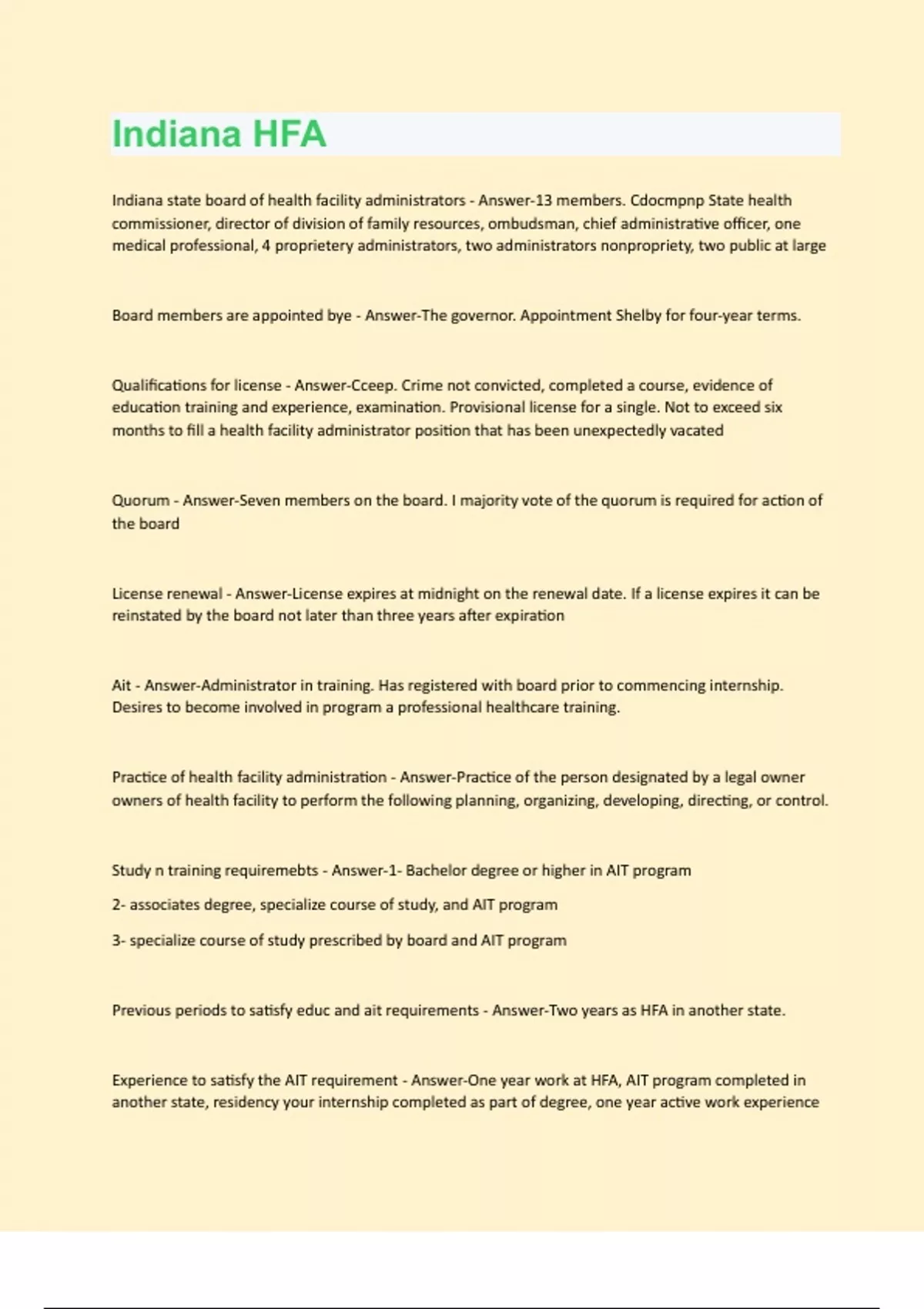 Indiana state board of health facility administrators - Answer-13 members. Cdocmpnp State health commissioner, director of division of family resources, ombudsman, chief administrative officer, one medical professional, 4 proprietery administrators, two administrators nonpropriety, two public at large Board members are appointed bye - Answer-The governor. Appointment Shelby for four-year terms. Qualifications for license - Answer-Cceep. Crime not convicted, completed a course, evidence of education training and experience, examination. Provisional license for a single. Not to exceed six months to fill a health facility administrator position that has been unexpectedly vacated Quorum - Answer-Seven members on the board. I majority vote of the quorum is required for action of the board License renewal - Answer-License expires at midnight on the renewal date. If a license expires it can be reinstated by the board not later than three years after expiration Ait - Answer-Administrator in training. Has registered with board prior to commencing internship. Desires to become involved in program a professional healthcare training. Practice of health facility administration - Answer-Practice of the person designated by a legal owner owners of health facility to perform the following planning, organizing, developing, directing, or control. Study n training requiremebts - Answer-1- Bachelor degree or higher in AIT program 2- associates degree, specialize course of study, and AIT program 3- specialize course of study prescribed by board and AIT program Previous periods to satisfy educ and ait requirements - Answer-Two years as HFA in another state. Experience to satisfy the AIT requirement - Answer-One year work at HFA, AIT program completed in another state, residency your internship completed as part of degree, one year active work experienceas CEO or COO in hospital. A masters degree in healthcare administration and six months of active work experience in HFA in another state Required training hours that may be waived - Answer-30% Application for exam must be complete - Answer-30 days before exam Applicants who do not pass - Answer-May take exam three times but must pass within one calendar year from date of first exam. If you fail all three times you must sit before the board. 3 failed exam attempts includes - Answer-200 hours of continuing education, a new application to the AIT program, proof of completion of the AIT program Display of license - Answer-Must display current license in a prominent location and individuals principal office Provisional license - Answer-May be issued for HFA or RCA if person has at least two years of administrative experience and a licensed health facility Programming for AIT - Answer-Honda as fab Standards of confidence practice, administration, housekeeping/laundry, facility management, nursing, dietary, activities, business office, and mission/marketing, overall facility management AIT seeking licensure as RCA - Answer-Not less than 80 hours of training and a license comprehensive care facility including Medicare and Medicaid regulations, health comprehensive care organization and coordination of services, assessments and care plans,