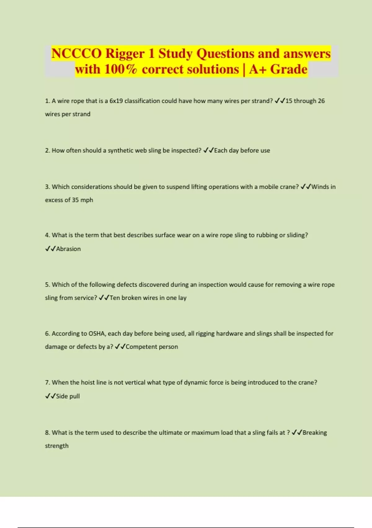 NCCCO Rigger 1 Study Questions and answers with 100% correct solutions | A+ Grade