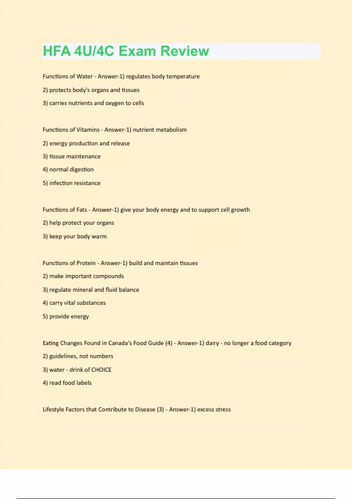 Functions of Water - Answer-1) regulates body temperature 2) protects body's organs and tissues 3) carries nutrients and oxygen to cells Functions of Vitamins - Answer-1) nutrient metabolism 2) energy production and release 3) tissue maintenance 4) normal digestion 5) infection resistance Functions of Fats - Answer-1) give your body energy and to support cell growth 2) help protect your organs 3) keep your body warm Functions of Protein - Answer-1) build and maintain tissues 2) make important compounds 3) regulate mineral and fluid balance 4) carry vital substances 5) provide energy Eating Changes Found in Canada's Food Guide (4) - Answer-1) dairy - no longer a food category 2) guidelines, not numbers 3) water - drink of CHOICE 4) read food labels Lifestyle Factors that Contribute to Disease (3) - Answer-1) excess stress2) drug/alcohol use 3) lack of sleep Foods High in Saturated Fat with Healthier Fat Alternatives (3) - Answer-1) butter - vegetable oil 2) cream cheese - hummus 3) regular cut meats - lean meats Food Choices Impacted by Our Emotions (3) - Answer-1) mental connections between events and food 2) emotional responses to food 3) using food to deal with emotion Functions of Fiber - Answer-1) soluble - lowers cholesterol to reduce heart disease 2) insoluble - reduces risk of colon cancer and cleans large intestine Balanced Vegetarian Meal - Answer-falafel pita (whole grain) with tahini sauce, vegetables, sour cream, and a glass of water Safety Guidelines for Defrosting and Marinating Meat (4) - Answer-1) defrost in fridge/cold water/microwave 2) marinate in tightly sealed container 3) store marinating meat in the fridge 4) do not reuse marinade Connection Between Types of Carbohydrates and Glycemic Index - Answer-1) refined grains -> less fiber - higher GI 2) whole grains -> higher fiber - lower GI Guidelines to Practice Healthy Eating (2) - Answer-1) choose whole-grains over refined2) cereals - look for at least 4g of fibre Stages in a Person's Life Cycle and Nutritional Requirements (2) - Answer-1) pregnancy; - folate: brain and spinal cord development - vitamin B12: makes red blood cells 2) infancy; - high quality protein: muscle & tissue growth - iron: increases hemoglobin Fat-Soluble Vitamins - Answer-Vitamins A, D, E, K Vitamin Toxicity - Answer-if too many fat soluble vitamins are stored in your body, poisoning can occur Antioxidant Vitamins - Answer-A, C, E High Sources of Iron - Answer-1) red meat 2) dark green leafy vegetables 3) whole grain breads _________ are primarily responsible for healthful lifestyle choices - Answer-you Absorption - Answer-the passage of nutrients from the digestive tract into the circulatory or lymphatic system Mental Health - Answer-the state of being comfortable with yourself, with others, and with your surroundings Social Health - Answer-being able to interact with others and participate in the community in both an independent and cooperative wayPhysical Health - Answer-relates to the efficient functioning of the body and its systems, and includes the physical capacity to perform tasks and physical fitness ________ is most likely to make a person feel full - Answer-fat If Unable to Drink Milk - Answer-Osteoporosis Uncontrollable Heart Risk Factors (2) - Answer-1) genetics 2) ethnicity Most at Risk for Danger from Food Poisoning (2) - Answer-1) young children 2) elderly Conditions Bacteria Needs to Grow (3) - Answer-1) nutrients 2) moisture 3) temperature