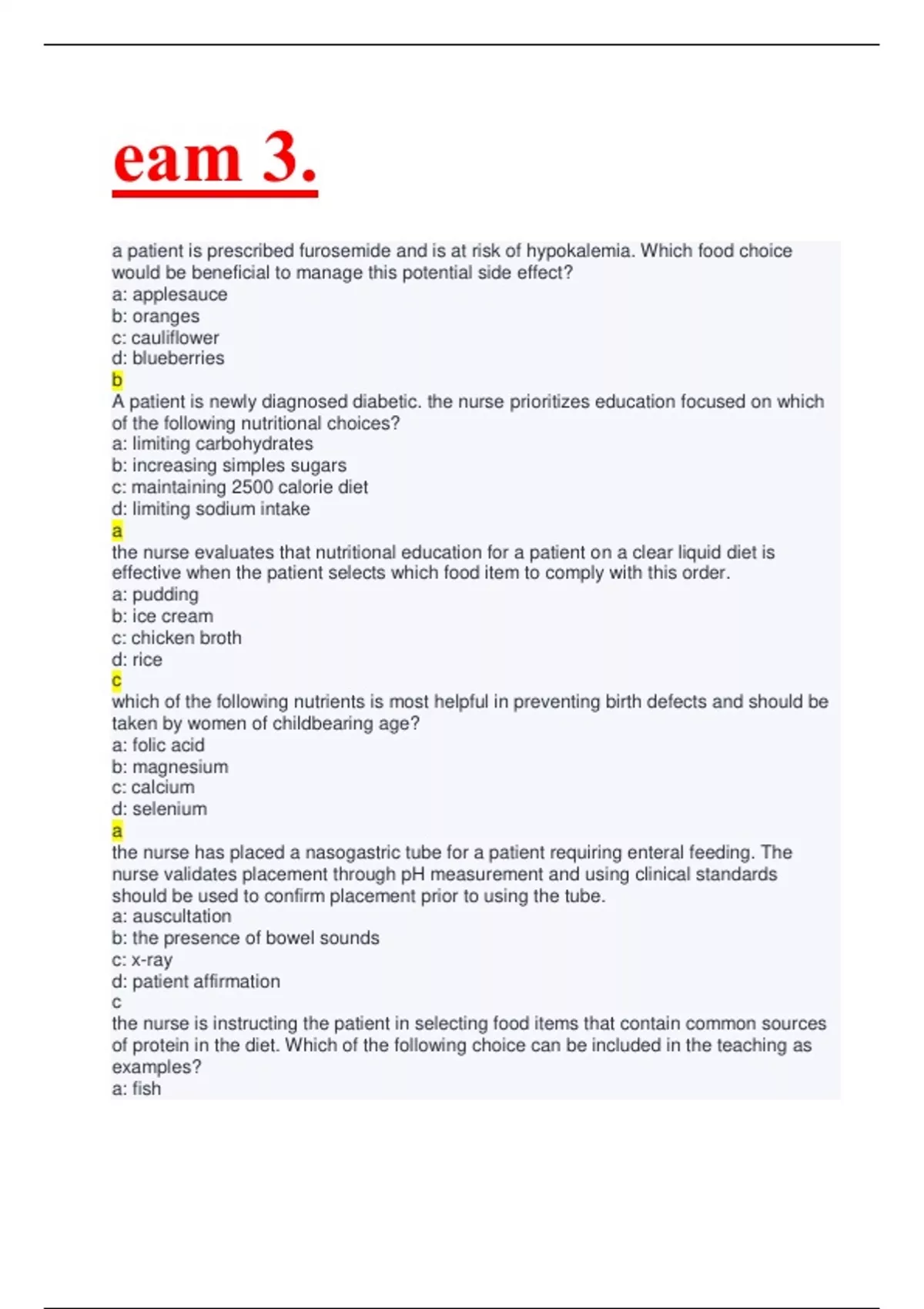 the nurse has placed a nasogastric tube for a patient requiring enteral feeding. The nurse validates placement through pH measurement and using clinical standards should be used to confirm placement prior to using the tube. a: auscultation b: the presence of bowel sounds c: x-ray d: patient affirmation c the nurse is instructing the patient in selecting food items that contain common sources of protein in the diet. Which of the following choice can be included in the teaching as examp